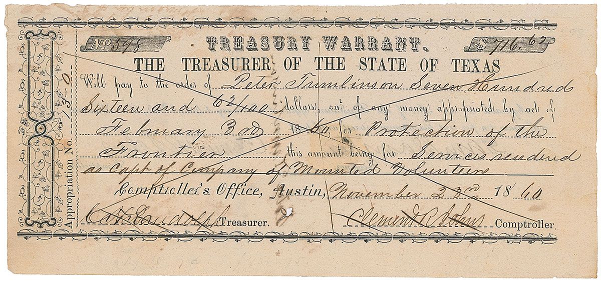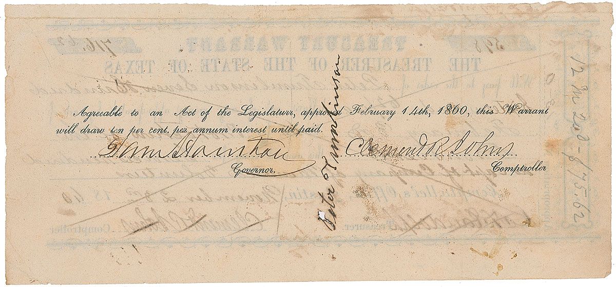 Partly-printed DS, one page both sides, 8.25 x 3.75, November 23, 1860. Treasury warrant issued to Peter Tumlinson for $716.62 for “protection of the frontier this amount being for services rendered as Capt of Company of Mounted Volunteers.” Signed on the reverse by Houston as governor and countersigned by Comptroller Clement R. Johns. In very good condition, with some scattered light toning, with one spot over end of Houston’s signature, a small spot of ink erosion to beginning of Tumlinson’s endorsement, and thin ink cancellation lines to front.
