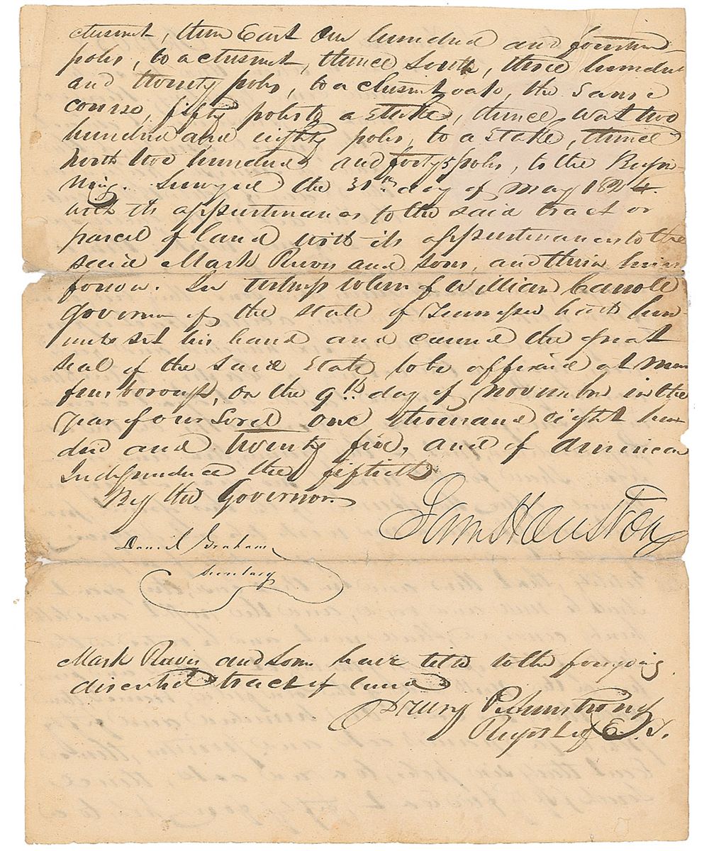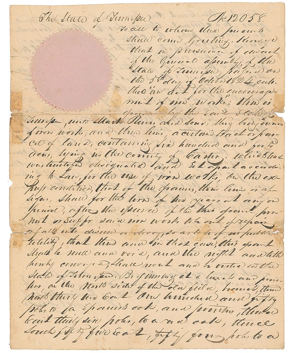 Manuscript DS, one page both sides, 8.25 x 10.25, November 9, 1825. Houston signs a grant in “pursuance of an act of the General Assembly, of the State of Tennessee, passed on the 5th day of October 1824…‘an act for the encouragement of iron works'…unto Mark Reeves and Sons, they being owners of iron works…a certain tract of parcel of land, containing Six hundred and forty acres, lying in the county of Carter…designated and according to Law, for the use of iron works.” Boldly signed at the conclusion by Houston and countersigned by a secretary, Daniel Graham. Paper seal affixed to the upper left remains crisp and fully intact. In very good condition, with repaired partial separations to both horizontal storage folds (toned tape visible on the front).