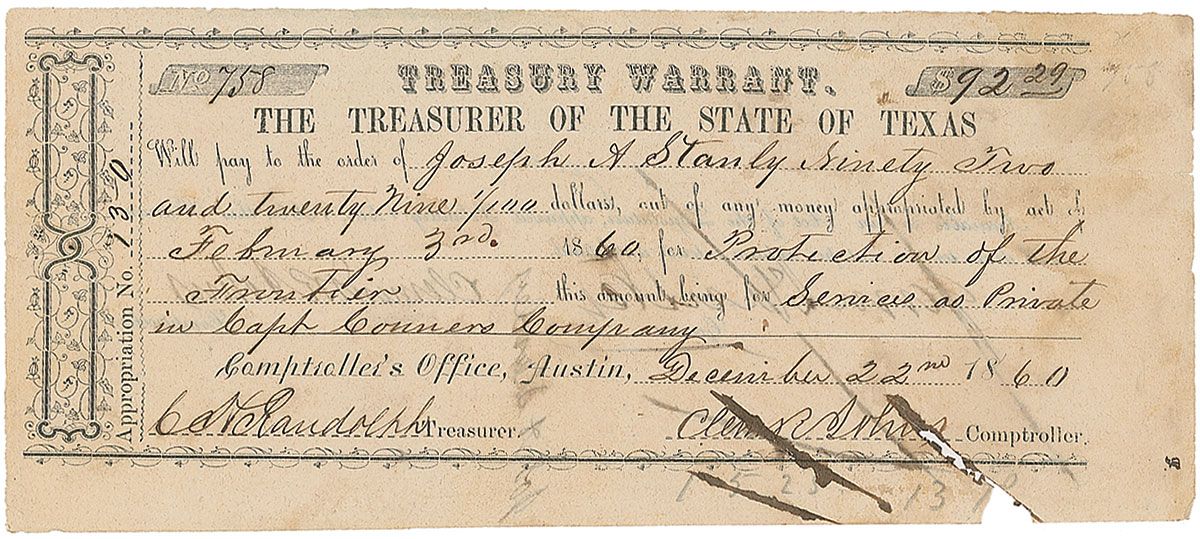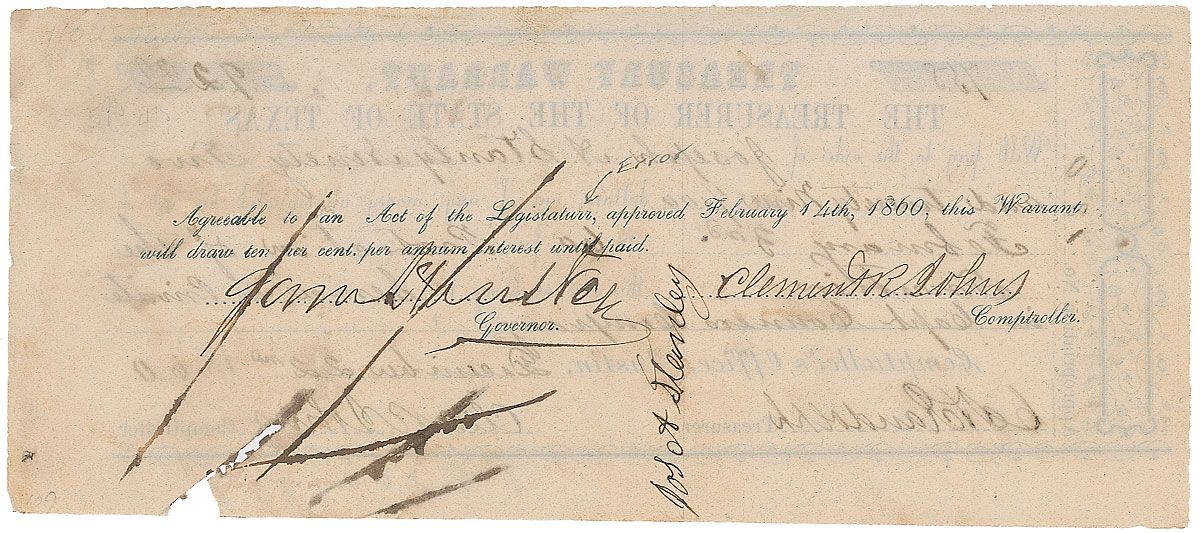 Partly-printed DS, one page, 8.5 x 3.75, December 22, 1860. Treasury warrant for $92.29 issued to Joseph A. Stanley for “protection of the frontier this amount being for services as Private in Capt. Conner’s Company.” Signed on the reverse by Houston as governor and countersigned by Comptroller Clement R. Johns. In very good condition, with two large cancellation marks passing through the signature and tears to the left edge and lower left (not affecting the signature).
