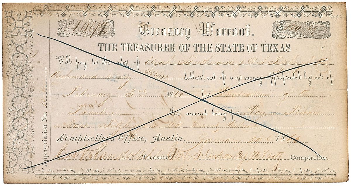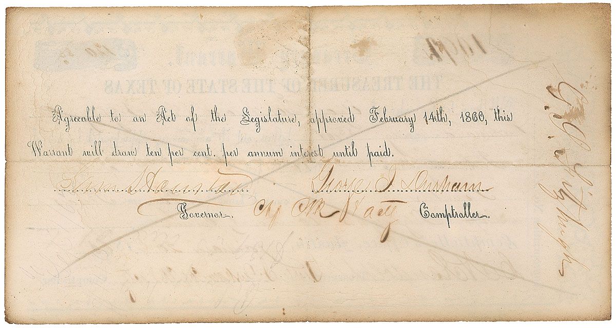Partly-printed DS one page both sides, 8 x 4.25, January 29, 1861. Treasury warrant for $120.83 issued to Elijah Southward for “protection of the frontier this amount being for Pay as Private in Capt. Fitzhugh’s Co. Mount Volunt.” Signed on the reverse by governor Sam Houston. Handwritten portions of document and Houston’s signature fairly light, but still legible, a central vertical fold, and ink cancellation “X” to front, and some scattered light toning and soiling, otherwise very good condition.