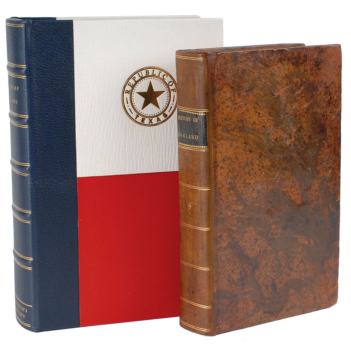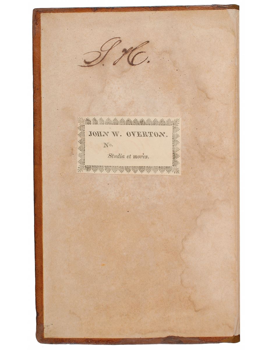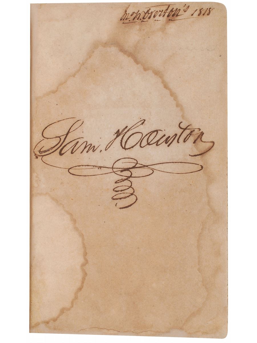 Signed book: The History of England from the Invasion of Julius Caesar to the Revolution in 1688. NY: Inskeep & Bradford, 1810. Hardcover, 5.5 x 9, 567 pages. Boldly signed on the first free end page in ink, “Sam Houston,” and initialed on the front pastedown, “SH.” Also signed at the top of the first free end page by Tennessee judge John W. Overton, with his bookplate affixed to the front pastedown. Autographic condition: very good, with heavy toning and dampstaining to the signed page (not affecting legibility or boldness of signature). Book condition: VG-/None (rebacked), in a NF custom-made clamshell case. This volume’s previous owner, John William Overton, was one of Tennessee’s most influential residents, serving as a judge on the state’s Supreme Court and as an advisor to President Andrew Jackson. Houston, taking a position as a local prosecutor, met Overton upon his arrival in Nashville in 1818 and the two became close friends. An exceptionally rare format for Houston, made ever more desirable by the bold signature and second set of initials.