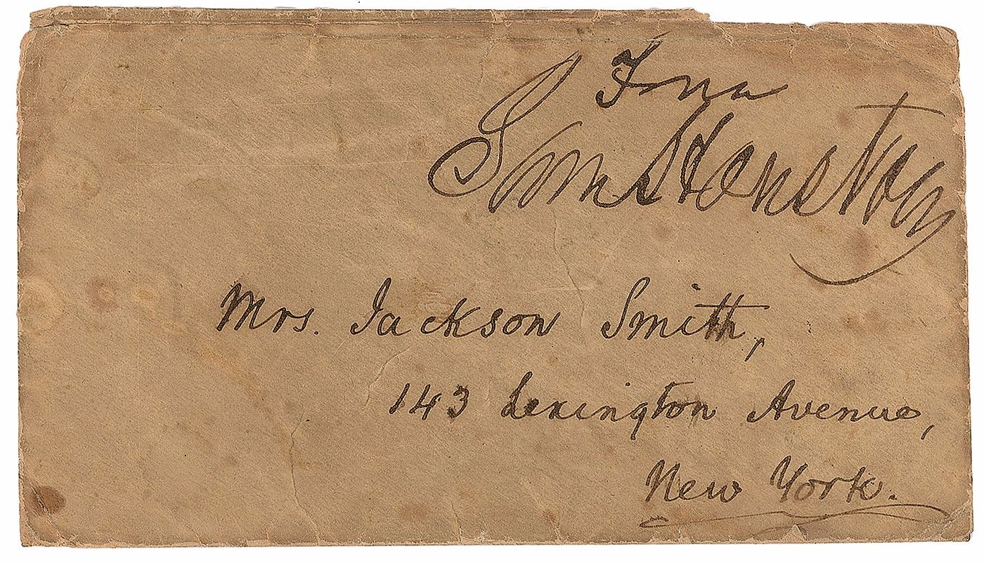 Boldly penned hand-addressed and free-franked mailing envelope, 5.5 x 3, addressed in Houston’s hand to “Mrs. Jackson Smith, 143 Lexington Avenue, New York,” and prominently franked in the upper right, “Free, Sam Houston.” In very good condition, with overall toning and staining.