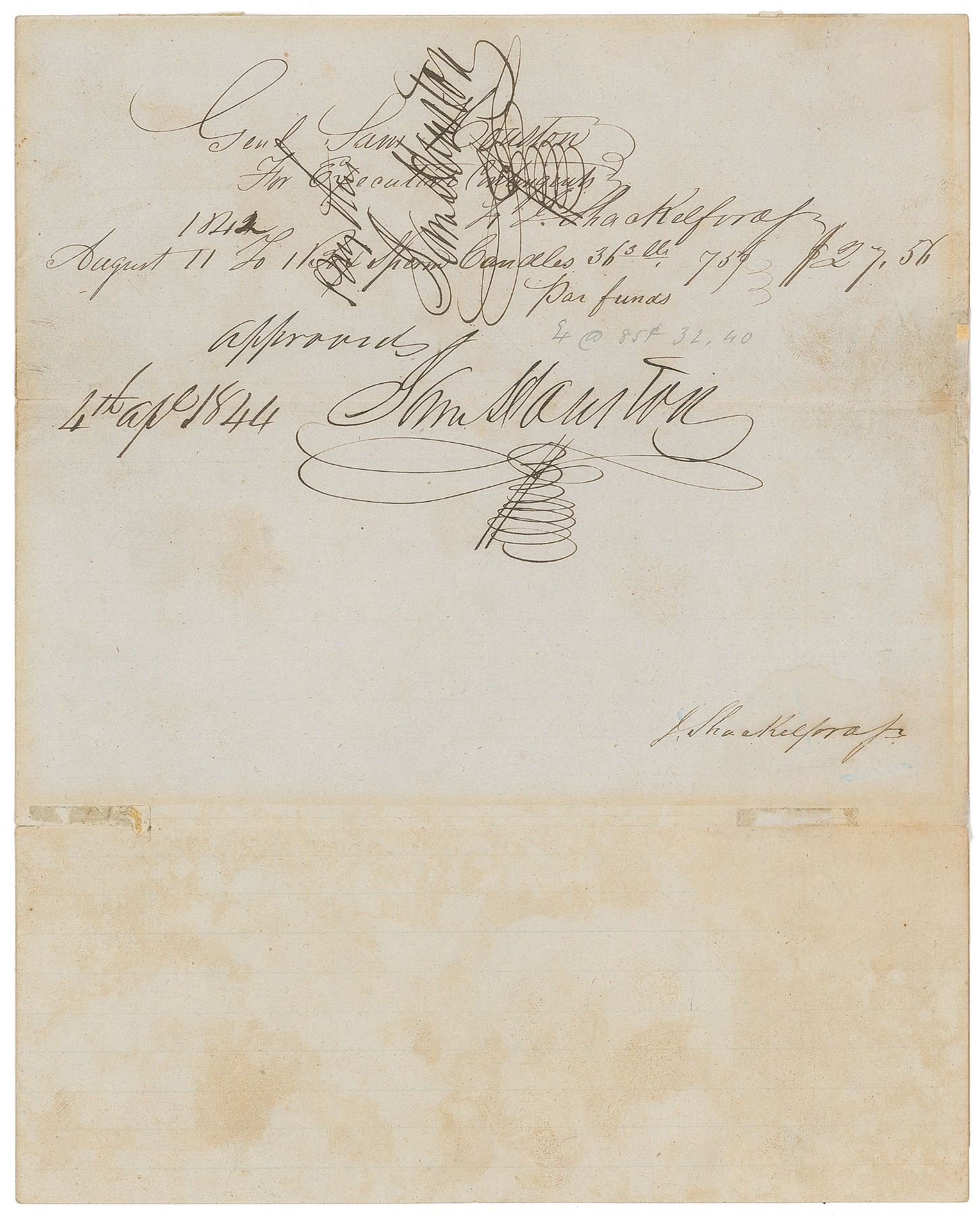 Twice-signed manuscript DS, one page, 7.75 x 9.75, April 4, 1844. Document approving the purchase of candles. In part: "Genl Sam Houston, For Executive Contingents, to J. Shackelford, August 11, 1842 To 1 Box Sperm Candles…$27.56." Signed at the conclusion by Houston, "Approved, Sam Houston, 4th Apl 1844," and also endorsed over the body of the document by Houston, "Pay this, Sam Houston." In very good condition, with scattered soiling, a horizontal fold passing through the main signature, and some small tape-repaired separations to folds. Jack Shackelford was a doctor who served in the Texas Revolution as a commander under James Fannin and was taken prisoner at the Battle of Coleto in 1836. While most of his fellow Texian prisoners were executed in the Goliad Massacre, Shackelford's life was spared so that he could care for wounded Mexican troops. This document dates to just one year before Texas was granted statehood, a significant moment in its history.