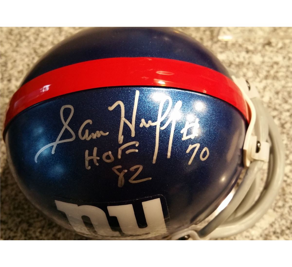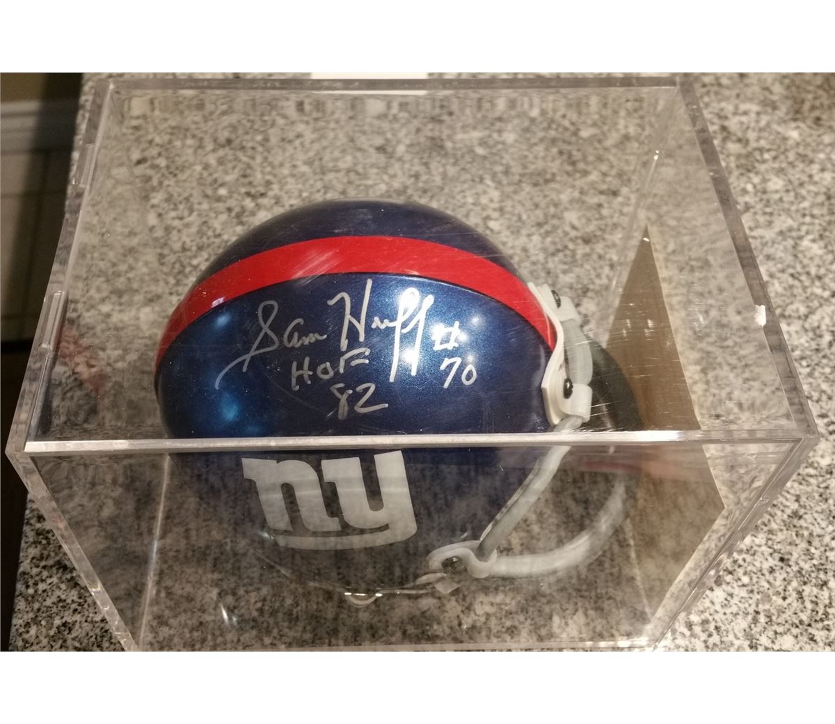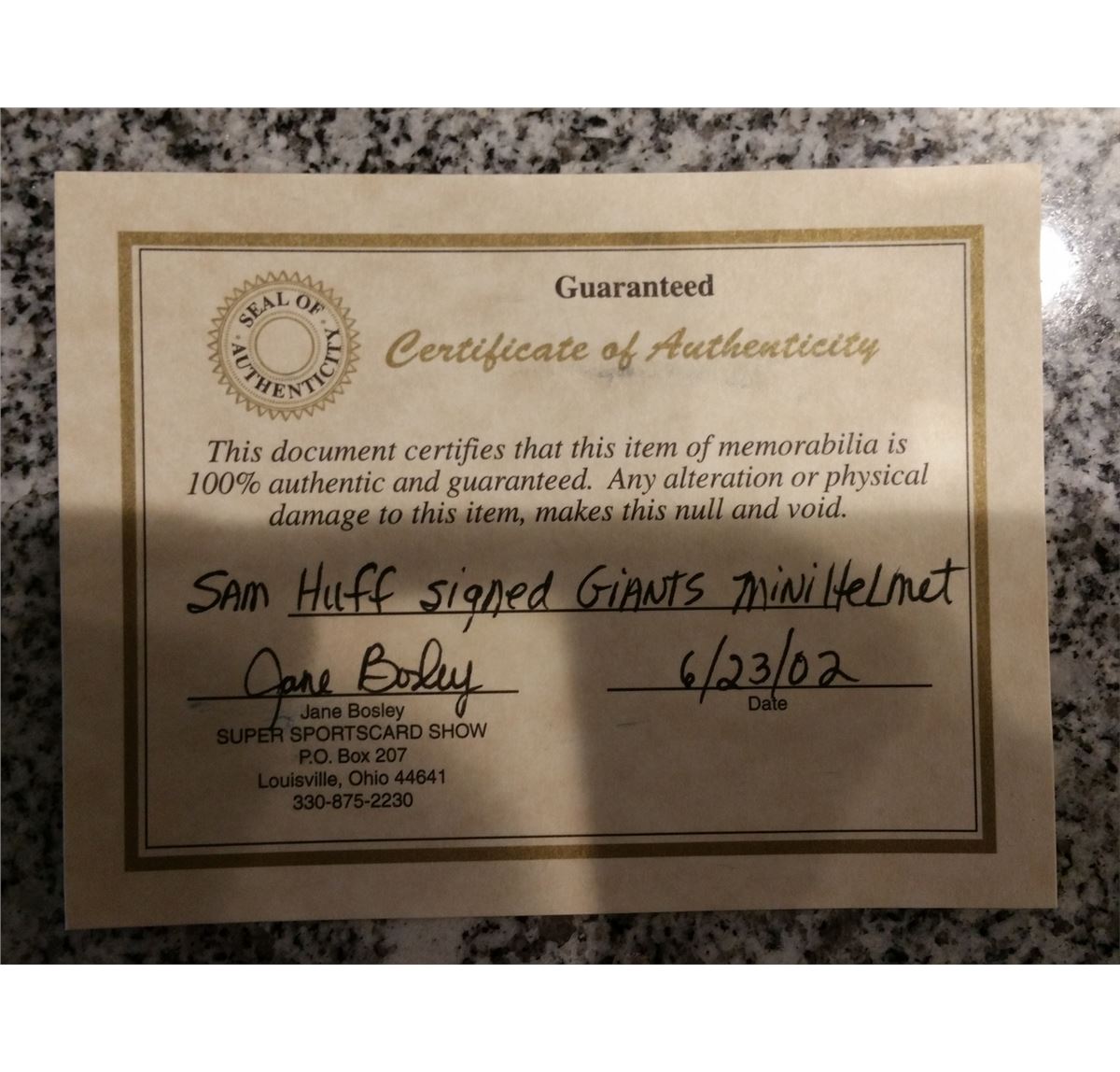 Silver sharpie signature of Sam Huff and will come with a clear cube and COA