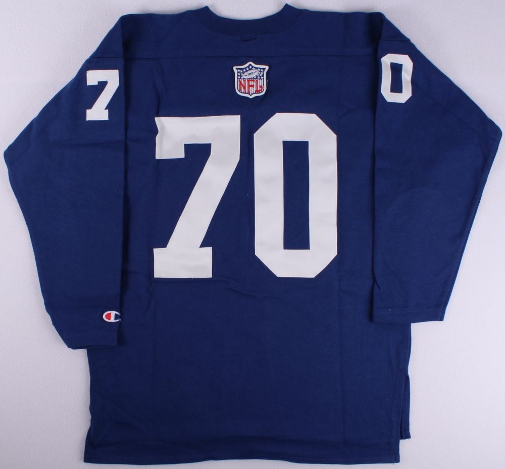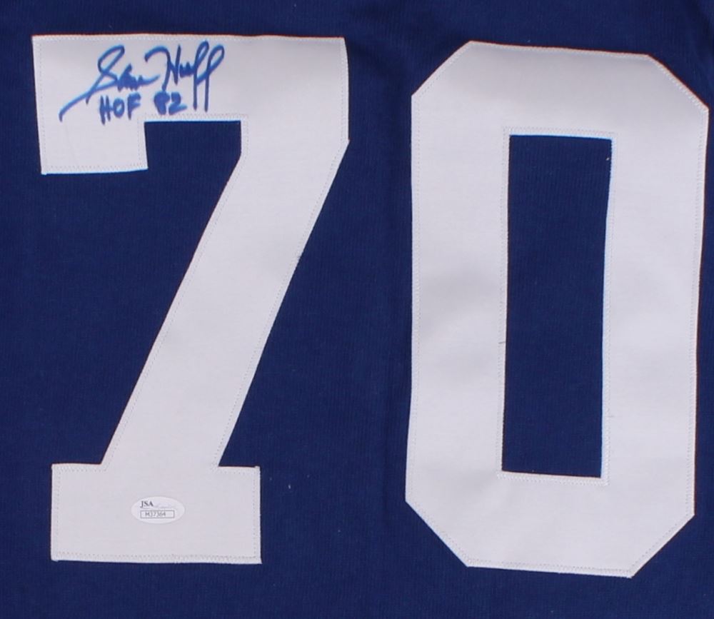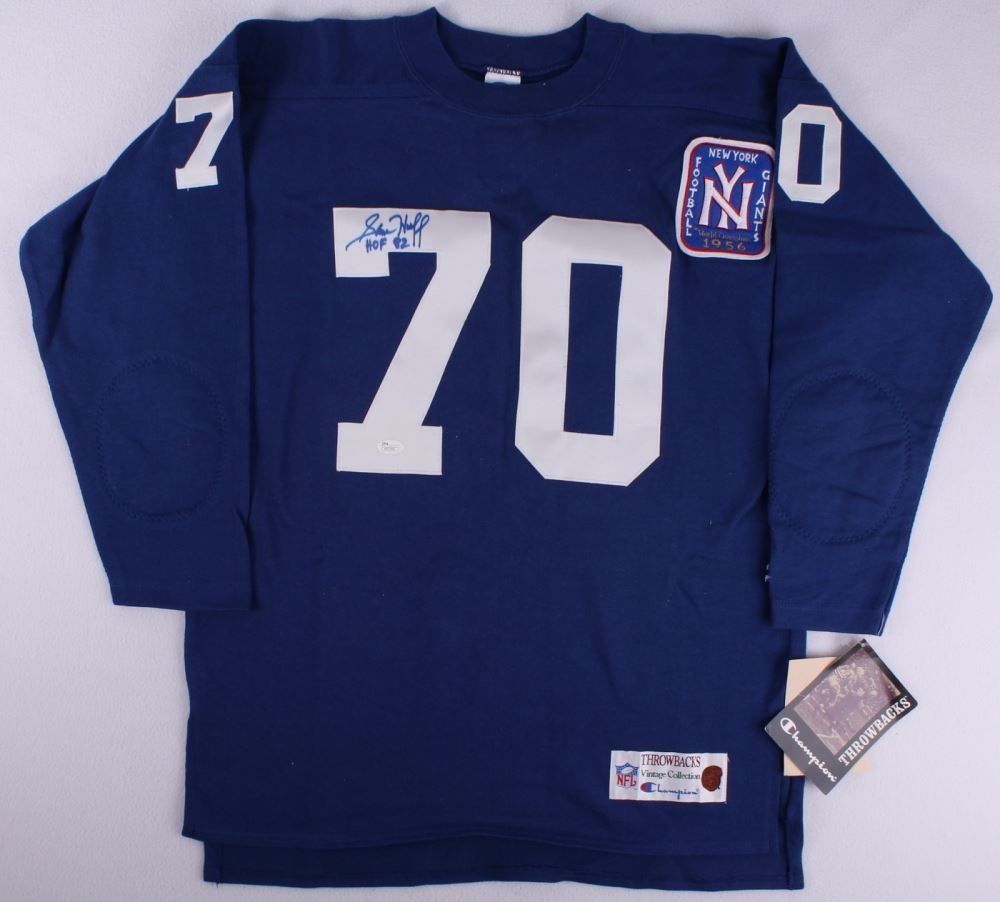 Champions on-field style Giants jersey. Everything is sewn on, size L. Hand-signed and inscribed in blue felt tip pen by Sam Huff. The autograph includes an official James Spence Authentication (JSA) hologram and matching COA for authenticity purposes.