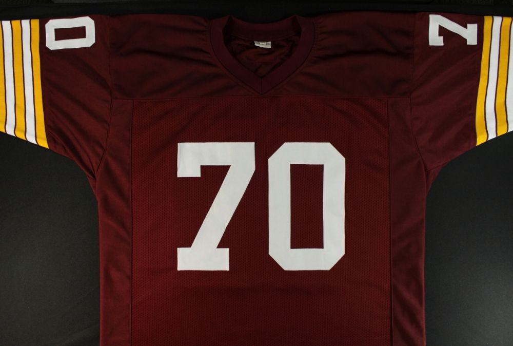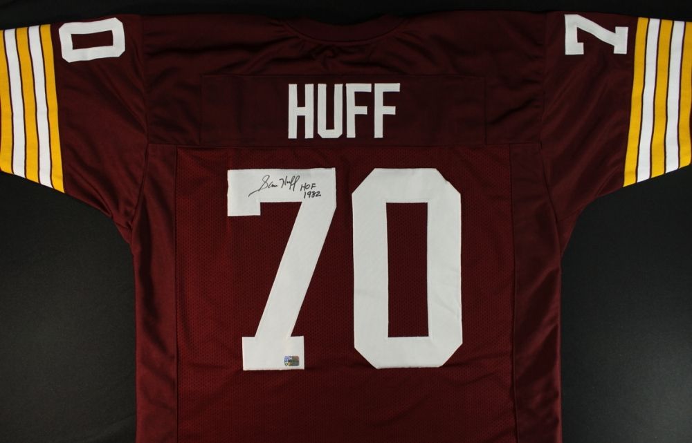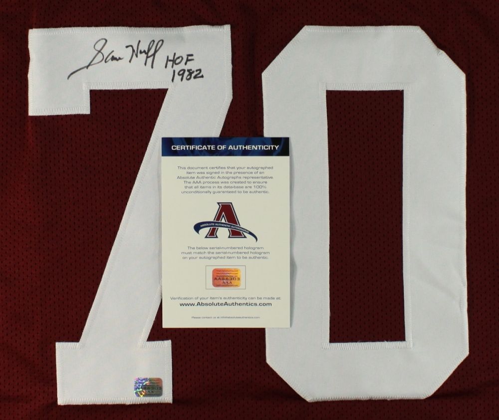 On-field style jersey. Everything is sewn on, size XL. Hand-signed and inscribed in black felt tip pen by Sam Huff. Autograph includes an Absolute Authentic Autographs (AAA) COA for authenticity purposes. The signing was witnessed by AAA.