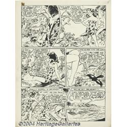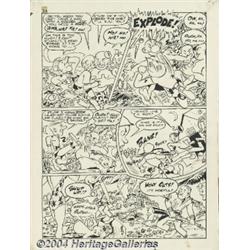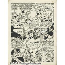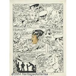 <B>Sam J. Glanzman - All-New Short Story Comics #3, Complete 6-page story "Why, Woeful Wilbert!" Original Art (Harvey, 1943).</B></I> Woeful Wilbert is a sad-faced swabbie who's not happy until he has something to grouse or fret about. He's the Navy's version of Sad Sack or Willie and Joe. This early work by Sam Glanzman, who has signed the strip "Samuel Glanz," shows his fascination with Naval subjects, even at this early date. Glanzman would go on to create perhaps the finest war stories ever done, the autobiographical "U.S.S. Steven" World War II tales. Wilbert is done in a "bigfoot" humor style, except for the lovely native girls, who are rendered in luscious detail. This approach falls squarely into the cartooning tradition set by Roy Crane with his <I>Wash Tubbs</B></I> newspaper strip. The image area of each page is approximately 13" x 18". There is a paste-up art correction on panel three of page six, otherwise the art is in Excellent condition. Glanzman joined the Navy in December of 1942, a year after Pearl Harbor, and this may have been one of his last stories before he joined up. In any case it is a historic early Sam Glanzman Navy story sure to thrill all war comics fans. <BR><BR><B>Important notice:</B> Heritage usually auctions material at the rate of 200-250 lots per hour. On some occasions eBay Live bid software or the Internet may not be able to keep up with the pace of the auction. We recommend placing a realistic absentee bid now as insurance to avoid disappointment. Occasionally the auctioneer may eliminate or reject an eBay Live bid, and the auctioneer may also reopen a lot after the close of the eBay live bidding (usually because we missed an audience bid), and may reject your bid even if it shows you as the winning bidder. By bidding via eBay Live, you agree that Heritage may award the lot to another bidder at its sole discretion under the circumstances described above or any other reasonable circumstances. Since eBay bids are not shown to us until we open the lot on the floor, we treat those bids just like floor bids. In most cases the floor responds before the eBay bid is presented to us, due to Internet lag time, so for consistency we have made it a policy that floor bids are always considered first over tie eBay live bids. Also please note that all Heritage lots purchased through eBay Live carry a 20% Buyer's Premium. Please make sure you read the Terms and Conditions before you bid.
