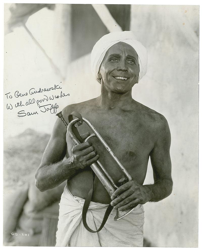 Glossy 7.5 x 9.25 photo of Jaffe as Gunga Din, signed and inscribed in black felt tip, “To Gene Andrewski, With all good wishes, Sam Jaffe.” Trimmed edges and scattered light creases and surface marks, otherwise fine condition.
