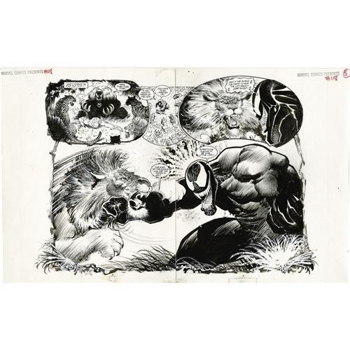 <B>Sam Kieth - Marvel Comics Presents #118, pages 4 and 5 Original Art (Marvel, 1992).</B></I> One of the most popular creators of the last two decades, Sam Kieth is perhaps best known for his work on <B>The Maxx</B></I>, a comic series that was later turned into a cartoon for MTV Networks in 1996. Kieth's work is rarely offered for public sale, making this striking double-page spread of Venom fighting a ferocious lion even more desirable. Beautifully rendered in the sumi-like style that Kieth has become famous for, this page demonstrates Sam's total mastery of the pen and ink medium. Measuring approximately 27" x 17" overall, this page is in Excellent condition, and is just waiting to take a place of honor in some lucky bidder's collection.