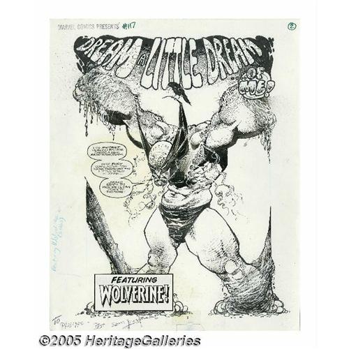 <B>Sam Kieth - Marvel Comics Presents #117, Splash Page 2 Original Art (Marvel, 1991).</B></I> With an innovative design approach, and luscious pen and ink work, Sam Kieth garnered popular and critical acclaim for his Wolverine series from " "<B>Marvel Comics Presents</B></I>. Intricately rendered, Kieth's dynamic style can only fully be appreciated in the original; too much detail was obscured in the less-than-perfect printing process used in the early 1990s. This splash page to the story, ""Dream a Little Dream,"" written by Howard Mackie, has an image area of 10.5"" x 15.5"". Aside from some light staining around the word balloons, and at the bottom around the title type, the art is in Excellent condition. Signed and inscribed the Sam Kieth at the bottom left. <BR><BR><B>Important notice:</B> Heritage usually auctions material at the rate of 200-250 lots per hour. On some occasions eBay Live bid software or the Internet may not be able to keep up with the pace of the auction. We recommend placing a realistic absentee bid now as insurance to avoid disappointment. Occasionally the auctioneer may eliminate or reject an eBay Live bid, and the auctioneer may also reopen a lot after the close of the eBay live bidding (usually because we missed an audience bid), and may reject your bid even if it shows you as the winning bidder. By bidding via eBay Live, you agree that Heritage may award the lot to another bidder at its sole discretion under the circumstances described above or any other reasonable circumstances. Since eBay bids are not shown to us until we open the lot on the floor, we treat those bids just like floor bids. In most cases the floor responds before the eBay bid is presented to us, due to Internet lag time, so for consistency we have made it a policy that floor bids are always considered first over tie eBay live bids. Also please note that all Heritage lots purchased through eBay Live carry a 20% Buyer's Premium. Please make sure you read the Terms and C