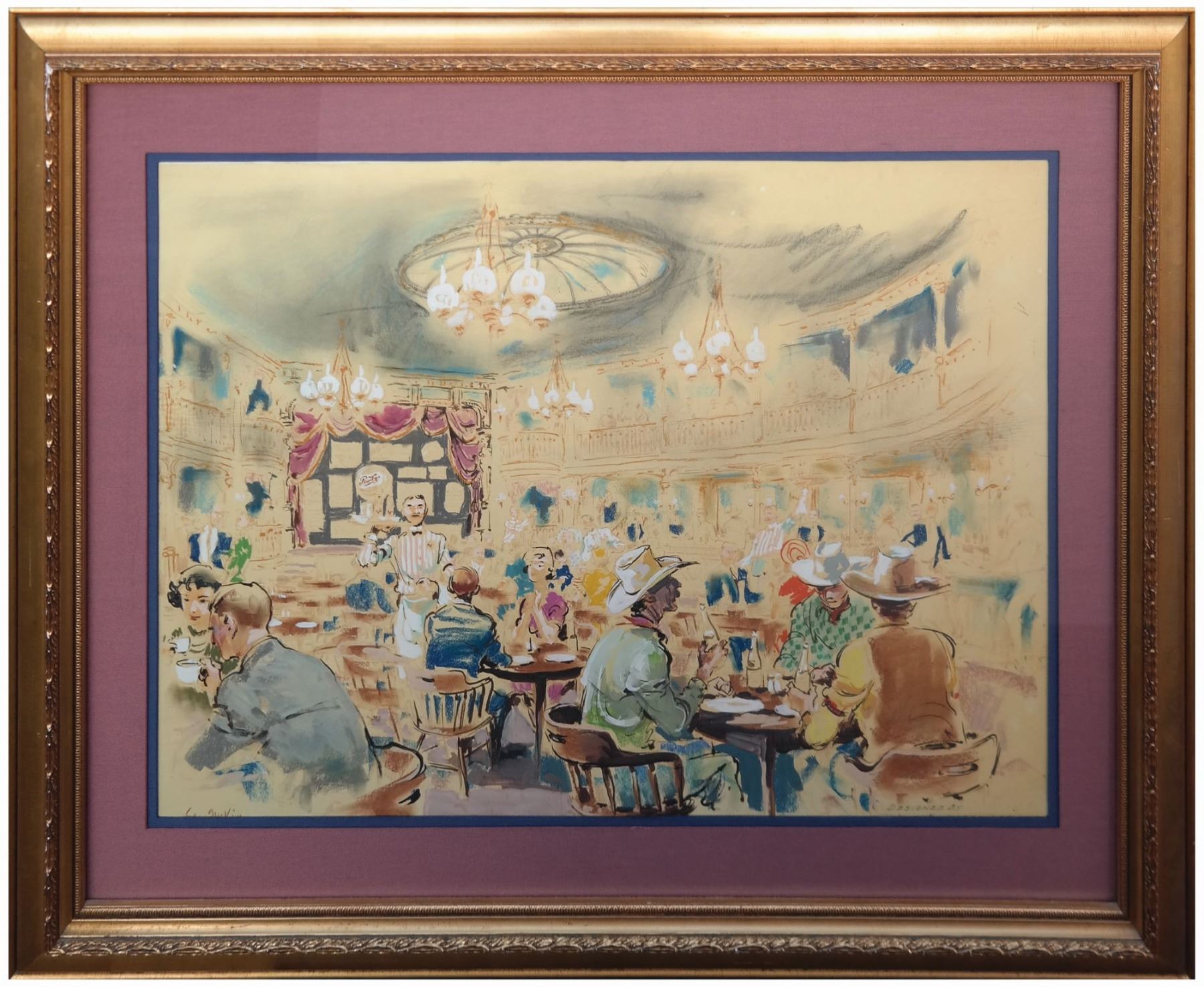 (Disneyland, c.1954-55) An original concept painting of the interior of Disneyland's Golden Horseshoe Saloon by Imagineer Sam McKim. For this artwork, McKim painted over a brownline print of his original pencil outlines to create this vibrant and easily recognizable image of the attraction. This original painting was more recently reproduced as decor for the Disneyland Hotel, as well as for commercial prints. This original artwork was officially sold through the Disney Gallery at Disneyland in 1988, and the painting is still in its original frame with a WED archive label attached to the reverse. Although McKim is best known to fans as the creator of the oversize souvenir maps that have become a Disneyland tradition, he also contributed to several attractions throughout the park, and some of the first paintings he created as an Imagineer were of the Golden Horseshoe. This painting has an image size of 25.5"x34.5" within a 38.5"x46.5" frame. The condition is very good, with some expected fading to the brownline from age, and some moisture discoloration to the back of the frame. The painting is signed by McKim in the lower-left corner.