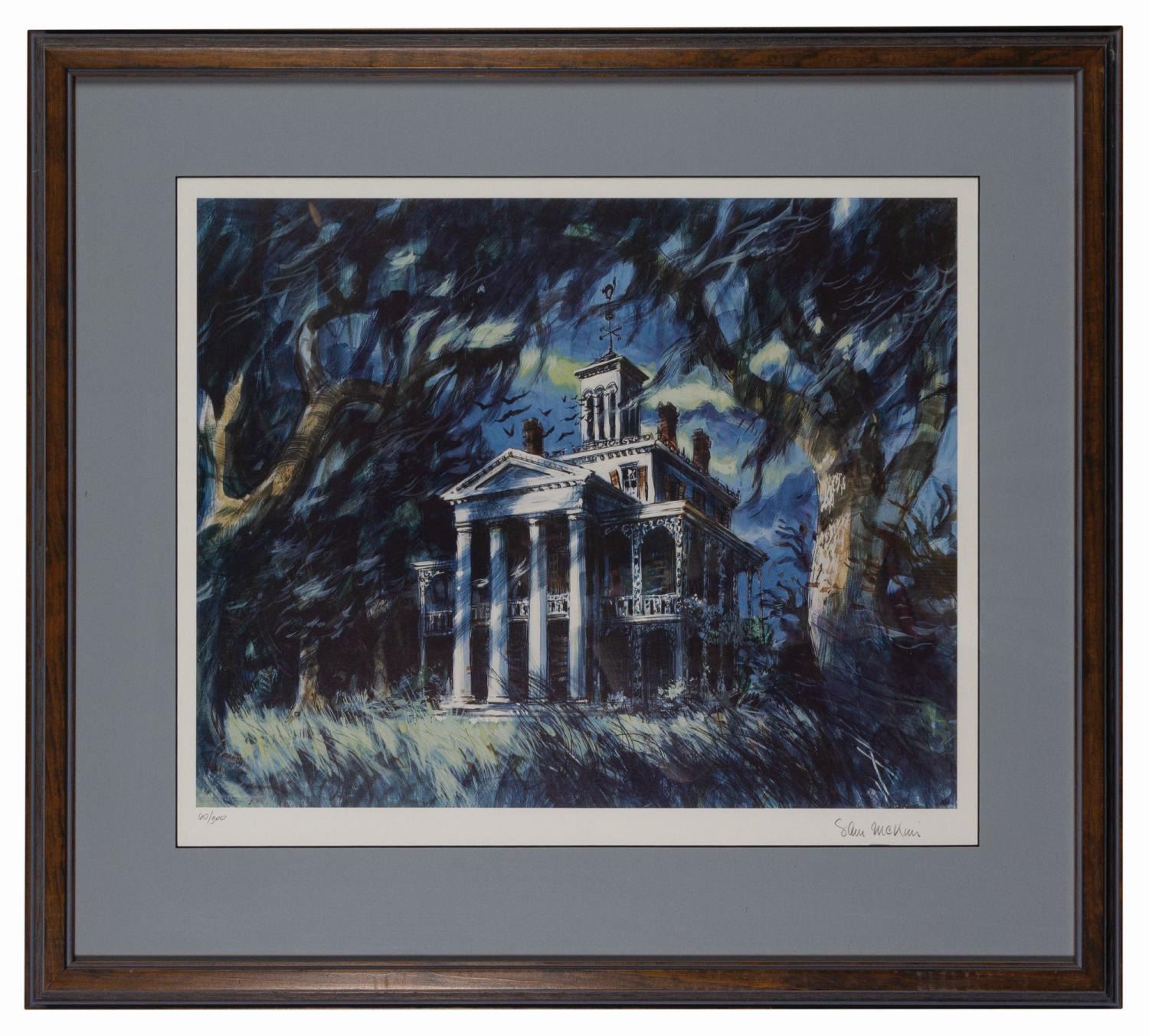 (Disneyland, 1987) A Disney Gallery limited edition lithographic print of Disneyland concept art for the Haunted Mansion by Imagineer Sam McKim based on a drawing by Imagineer Ken Anderson. The print retains a debossed Disney Gallery stamp at lower right. it is signed in pencil by the artist at lower right, "Sam McKim," and hand-numbered at lower left, "60/300." Measuring 17.5"x21" within a 26"x29" wooden frame, the piece appears to be in fine condition, though is unexamined out of the frame. It is accompanied by a Disney Gallery COA.