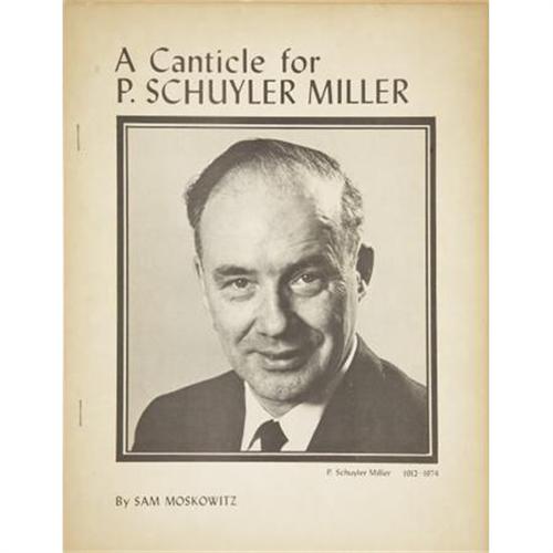 <B>Sam Moskowitz. </B></I><B><I>A Canticle for P. Schuyler Miller</B></I></B></I><B>.</B></I> Newark: Sam Moskowitz, 1975.<BR> <BR>First edition limited to 300 copies signed by the author on the introduction page. Quarto. 11 pages.<BR><BR>Wraps with two-staple binding. Covers toned. Pages moderately toned. Very good. <I>From the Robert and Diane Yaspan Collection.</B></I><BR><BR><b>Shipping:</b> Books & Catalogs (<a target="_blank" href="http://www.heritageauctions.com/common/shipping.php">view shipping information</a>)