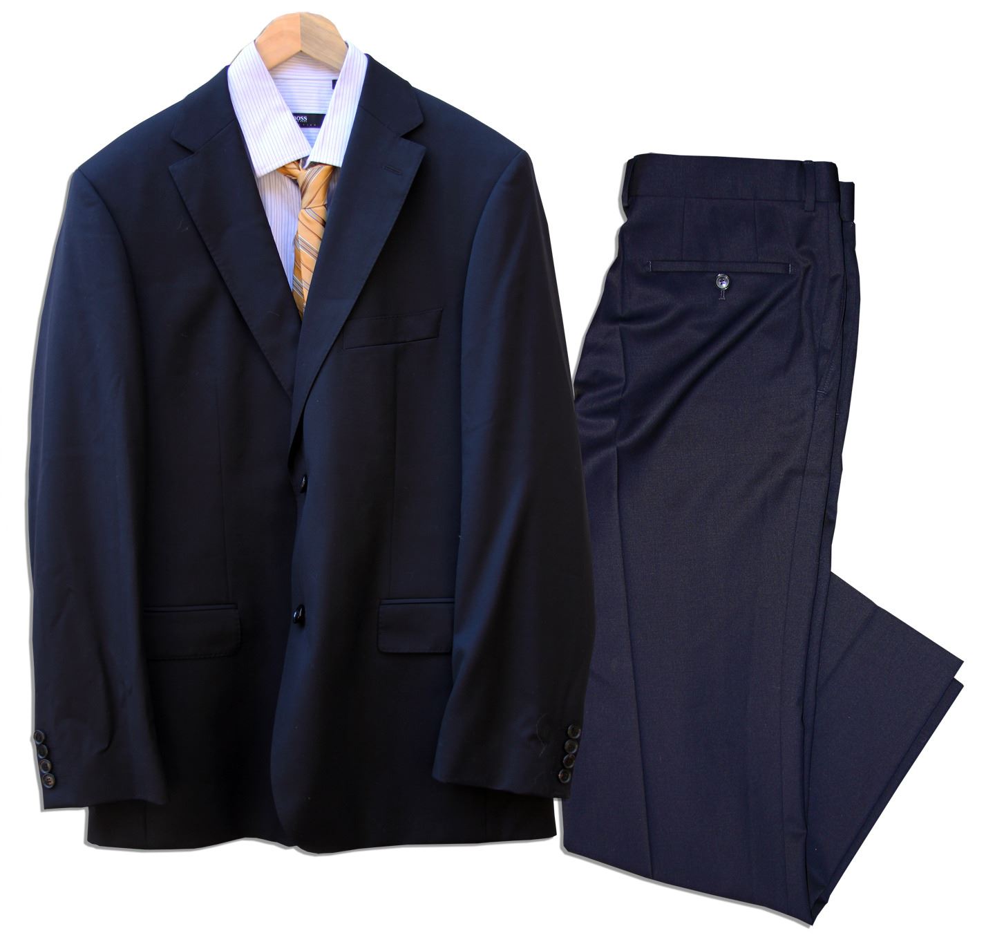 Sam Neill screen-worn wardrobe from ''The Vow''. Ensemble includes a Boss brand navy blue jacket and pants, with dress shirt and tie. Pants are size 42 and striped shirt is size 41/16. Tie is by Robert Talbot. Near fine. With COA from Premiere Props.