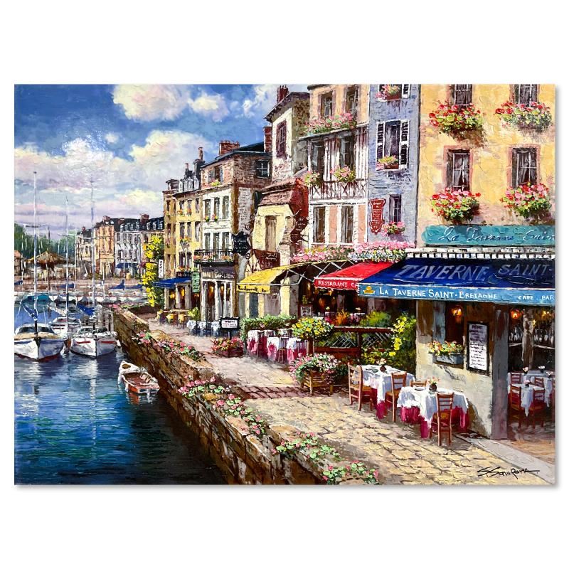 "Harbor at Honfleur" is a hand embellished limited edition publisher's proof on stretched canvas by Sam Park, numbered and hand signed by the artist. Includes Letter of Authenticity. Measures approx. 18" x 24" (image). There may be minor wear on the corners and edges.