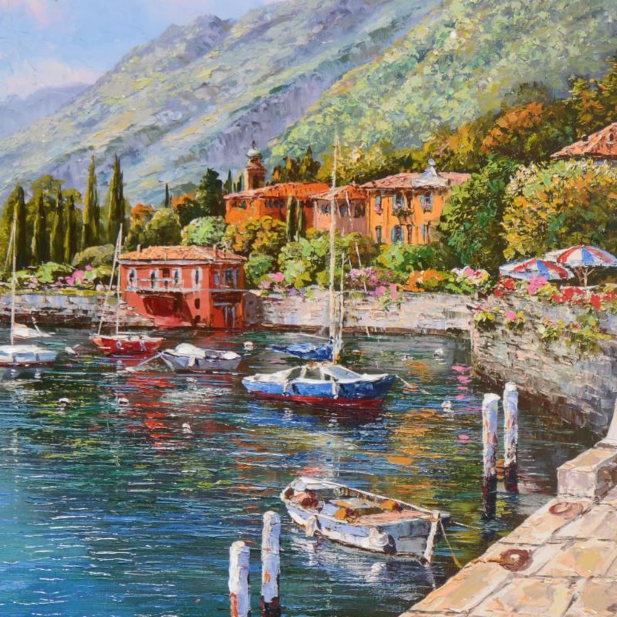 "Lake Como Villa" is a hand embellished limited edition serigraph on canvas by Sam Park, numbered and hand signed by the artist. Includes Certificate of Authenticity. Measures approx. 30" x 24" (image). Reference #: 228687.