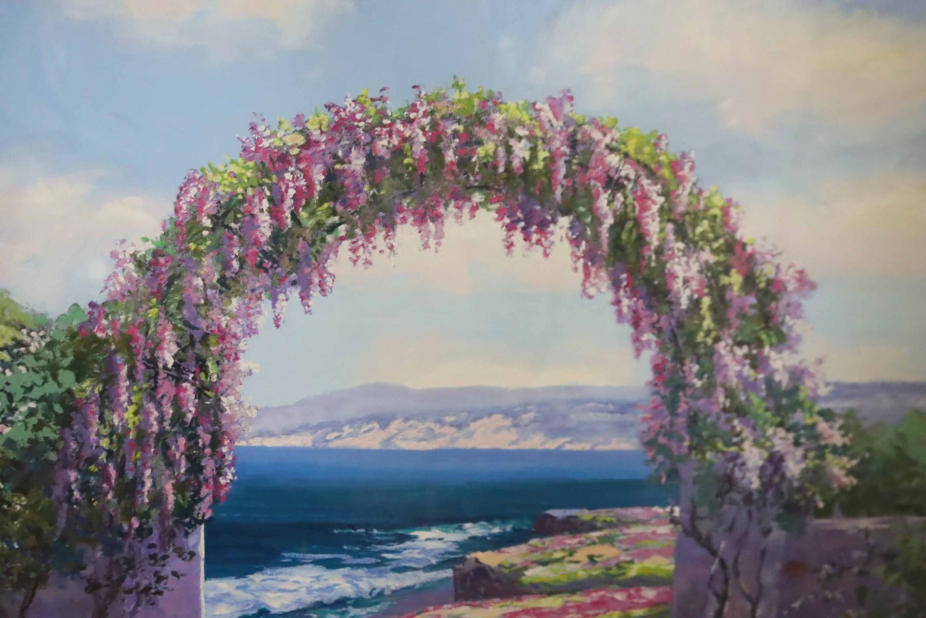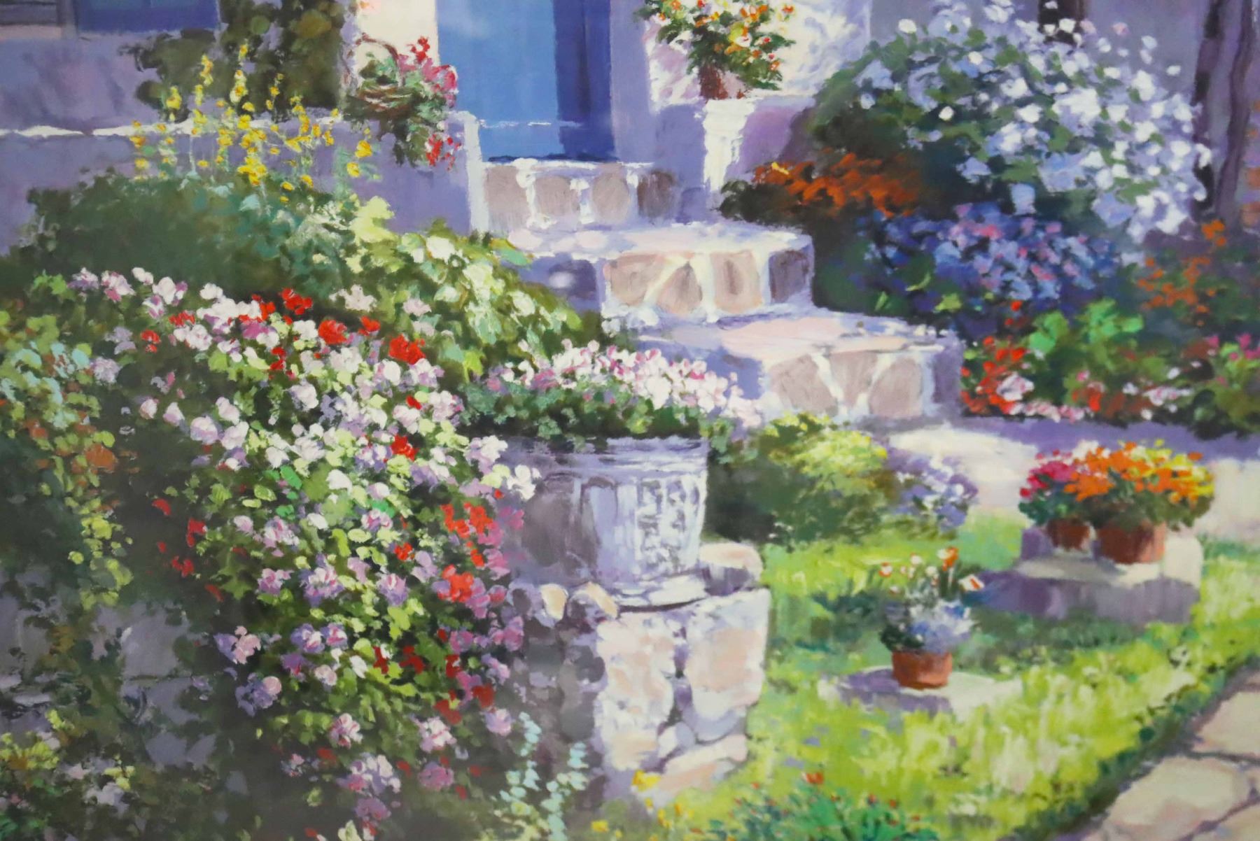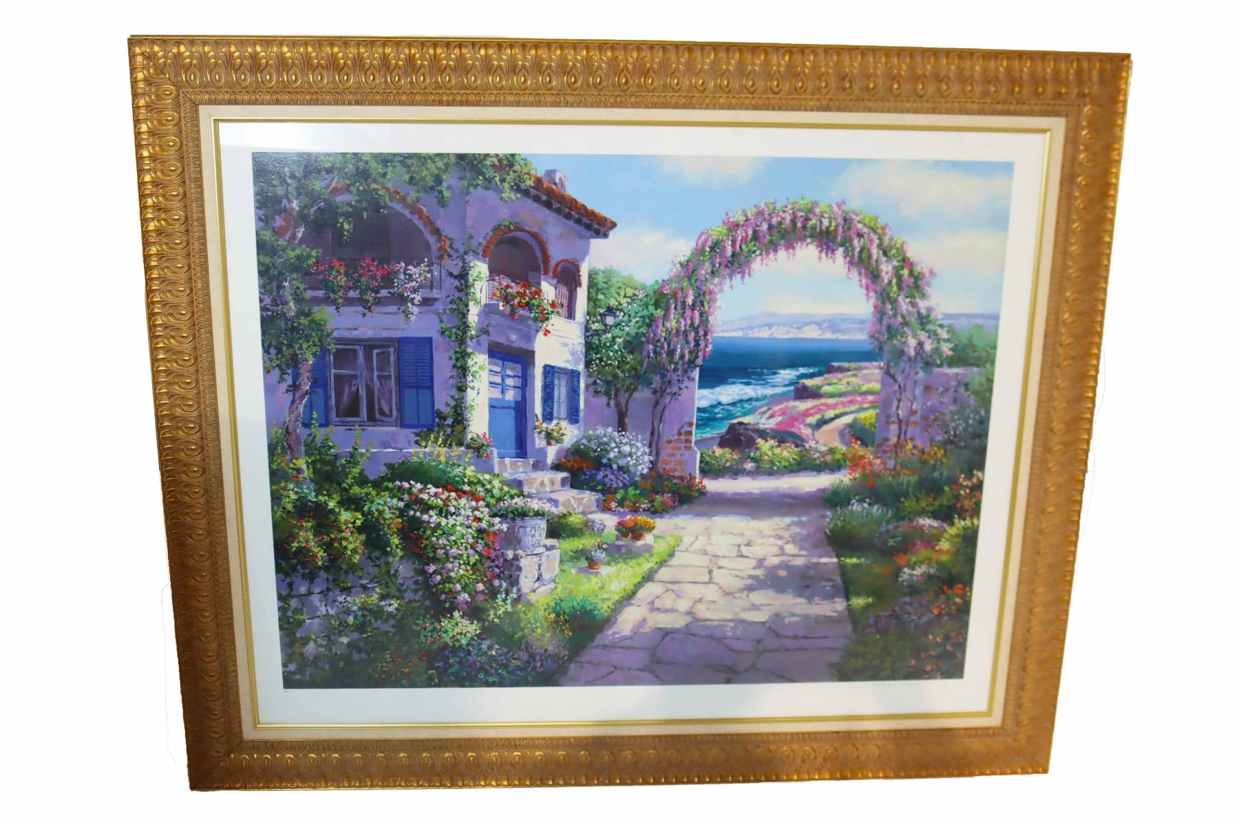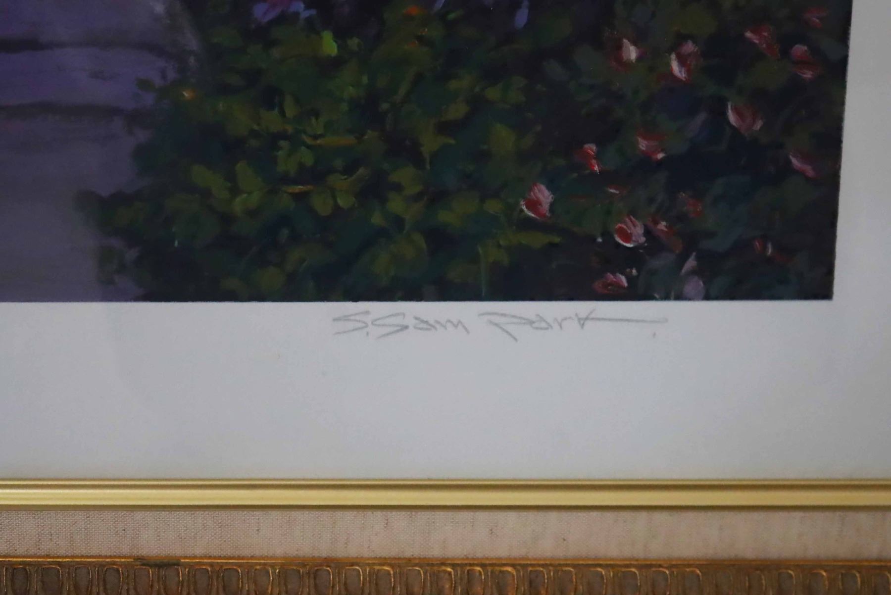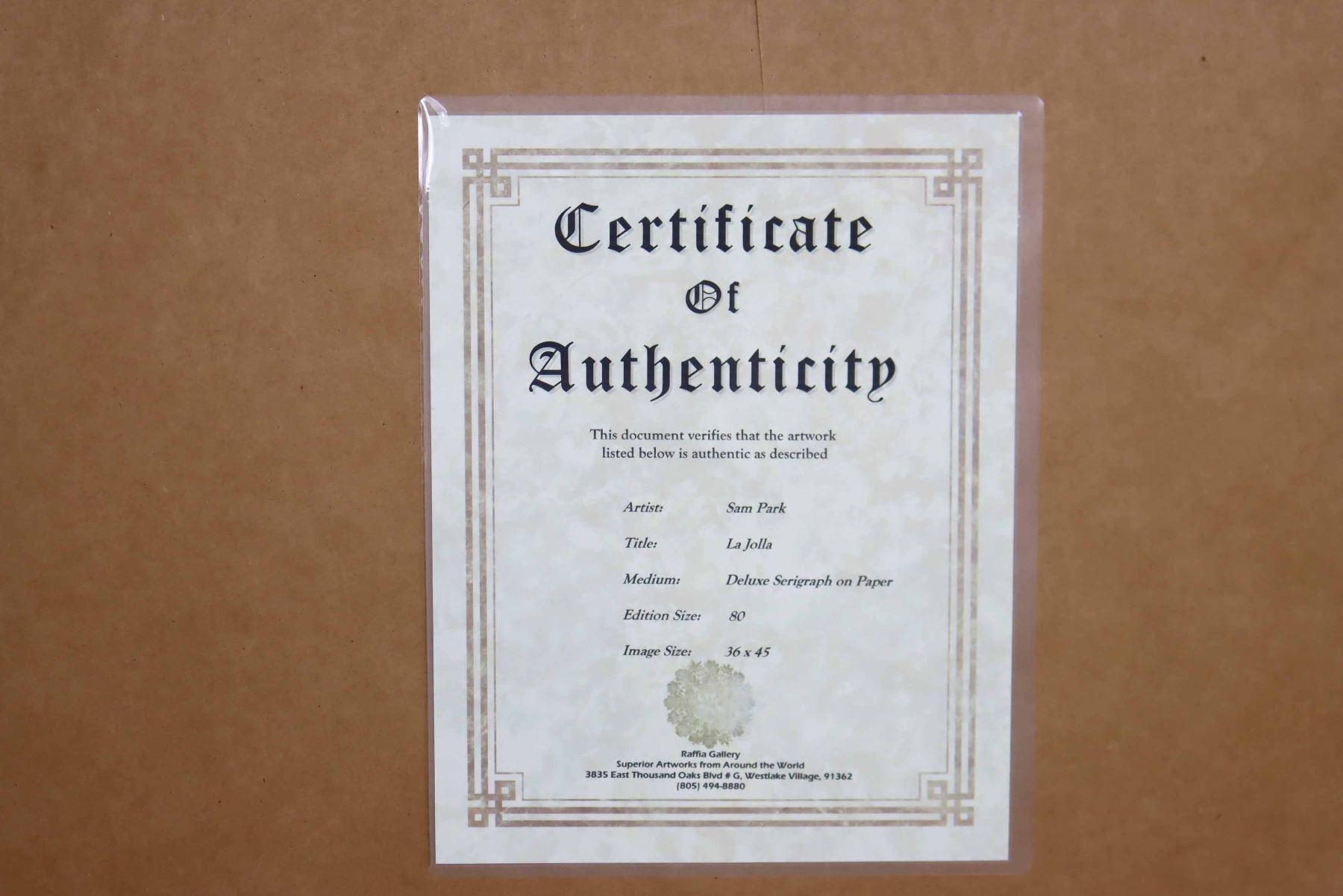 "La Jolla", a colorful depiction of a coastal estate; comes with COA from Raffia Gallery. Edition 66/80. Sam (Sung Sam) Park is active in California, South Korea, France, and known for Impressionist coastal scene landscape painting from world travels.