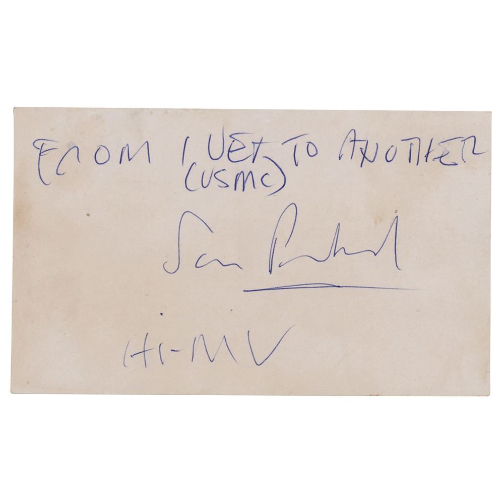 Ballpoint signature, "From 1 vet to another (USMC), Sam Peckinpah, Hi-MV," on an off-white 5 x 3 card. In fine condition.