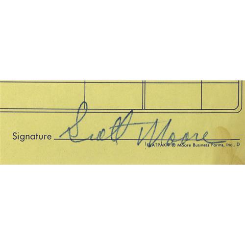 <B>Sam Phillips Recording Studio Invoice Copy signed by Scotty Moore (1963)</B></I> While Elvis was in Hollywood making movies, his original guitarist, Scotty Moore, had returned to his roots. He resumed the role he played at the original Sun Studio, as engineer and session player, at Sam Phillip's new studio at 639 Madison Avenue (Sun was at 706 Union Ave). Here's the yellow carbon copy of an 8-1-63 invoice for six master recording stylus needles, for a total of $60. It was signed "Scott Moore" at the bottom. In VG+ condition, with several small stains at the right side.