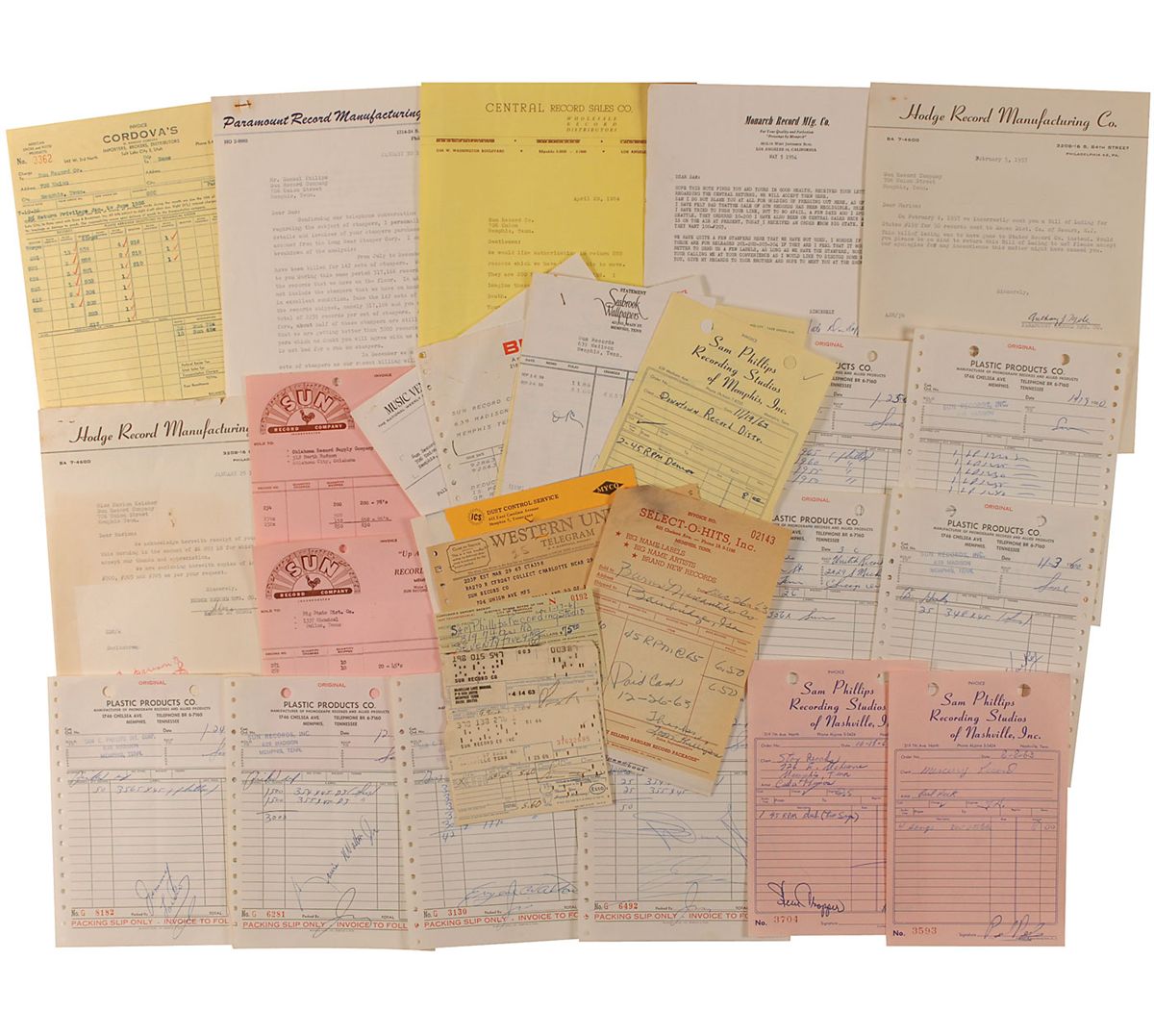 Collection of approximately 30 items relating to Sam Phillips and Sun Records, including correspondence from Sun Records personnel, receipts and bills to and from Sun Records, and two credit card carbon receipts. None of the items are signed by Phillips. In overall fine condition. Accompanied by a certificate of authenticity from Tracks.