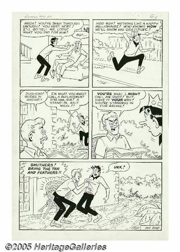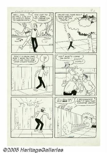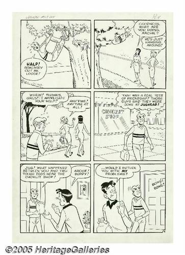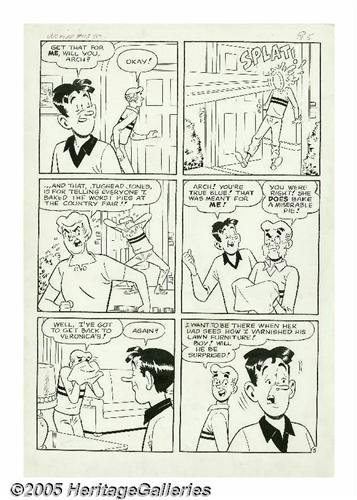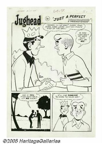 <B>Sam Schwartz - Archie's Pal Jughead #113 Complete 6-page Story "Just A Perfect Friendship" Original Art (Archie, 1964).</B></I> Archie and Jughead pledge an undying friendship to each other and then the hilarity begins as Archie is put through the paces taking a lot of lumps meant for Jughead. The tables are turned at the end of the yarn, though. Terrific, crisply inked artwork is the highlight of this laugh-riot. The image area of each page is 12" x 17.5", and the art is in Excellent condition.