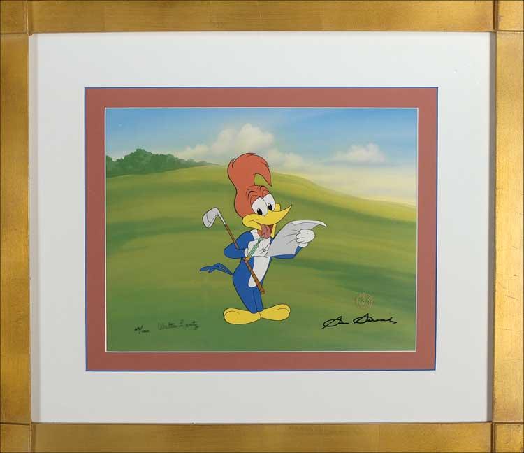 Limited edition animation cel, 16 x 12.5, of Woody Woodpecker writing his golf score, #69/100, and set against a pre-print background. Signed in black felt tip by Sam Snead and Walter Lantz. Double matted and framed to an overall size of 27 x 23.5. In very fine condition. Oversized. Pre-certified Steve Grad/PSA/DNA and RRAuction COA.
