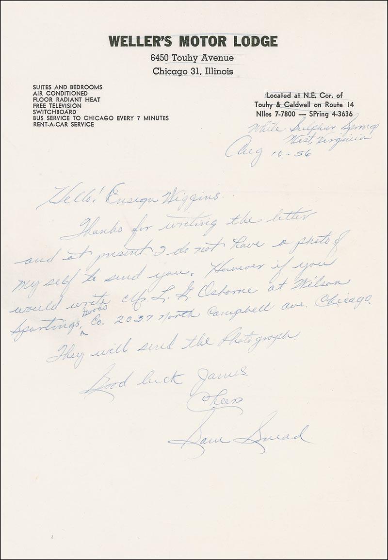 ALS, one page, 7.25 x 10.5, Weller’s Motor Lodge letterhead, August 16, 1956. Snead responds to a navy lieutenant’s request for a photo. In part: “At present I do not have a photo of myself to send you.” In fine condition, with light wrinkling.