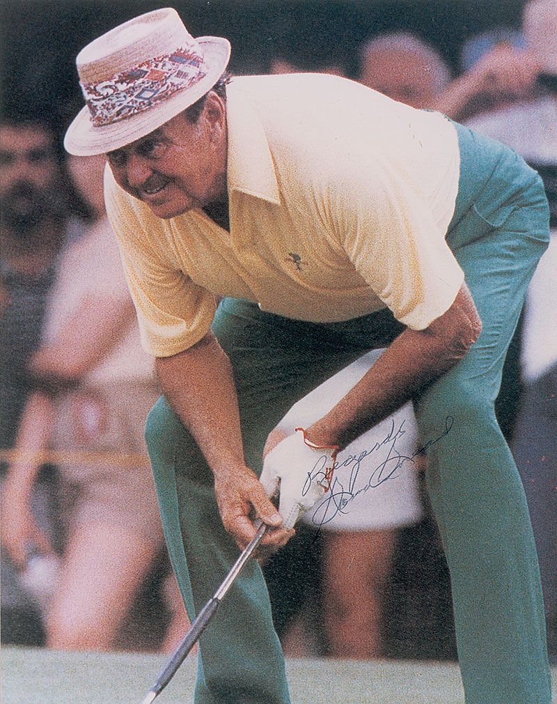 Color glossy 8 x 10 photo of Snead lining up a putt, signed in blue ballpoint, “Regards, Sam Snead.” In fine condition.