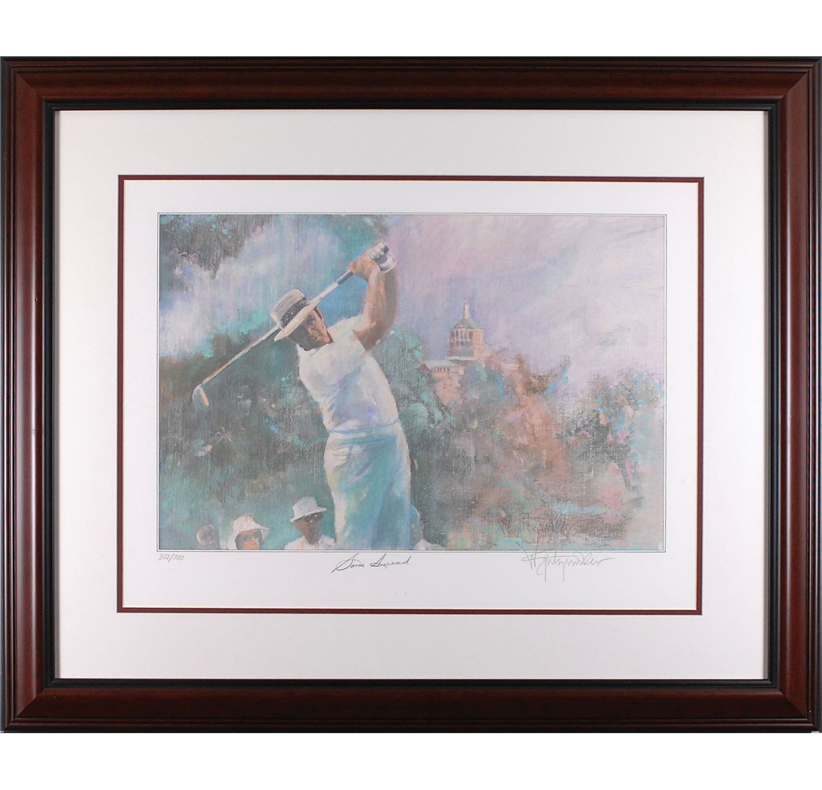 Color limited edition 23.5 x 17.5 print of Snead hitting an iron shot, numbered 382/700, signed in the lower border in pencil. Also signed in pencil by the artist. Double-matted and framed to an overall size of 34 x 28. In very fine condition. Oversized.