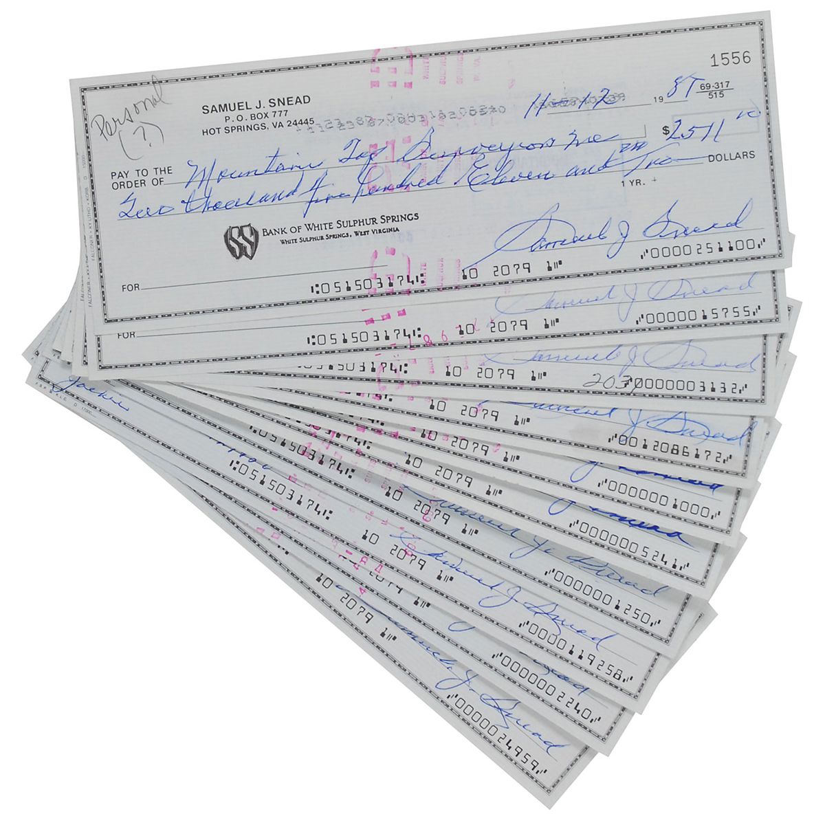 Collection of 10 personal checks, 8.25 x 3, all filled out and signed by Snead, “Samuel J. Snead,” all dated from 1984. In fine condition, with expected bank stamps, lightly affecting a couple of signatures, and central vertical folds to some.