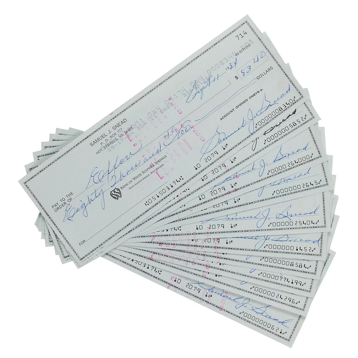 Collection of 10 personal checks, 8.25 x 3, all filled out and signed by Snead, “Samuel J. Snead,” all dated 1984. In fine condition, with expected bank stamps, slightly affecting a couple of signatures.