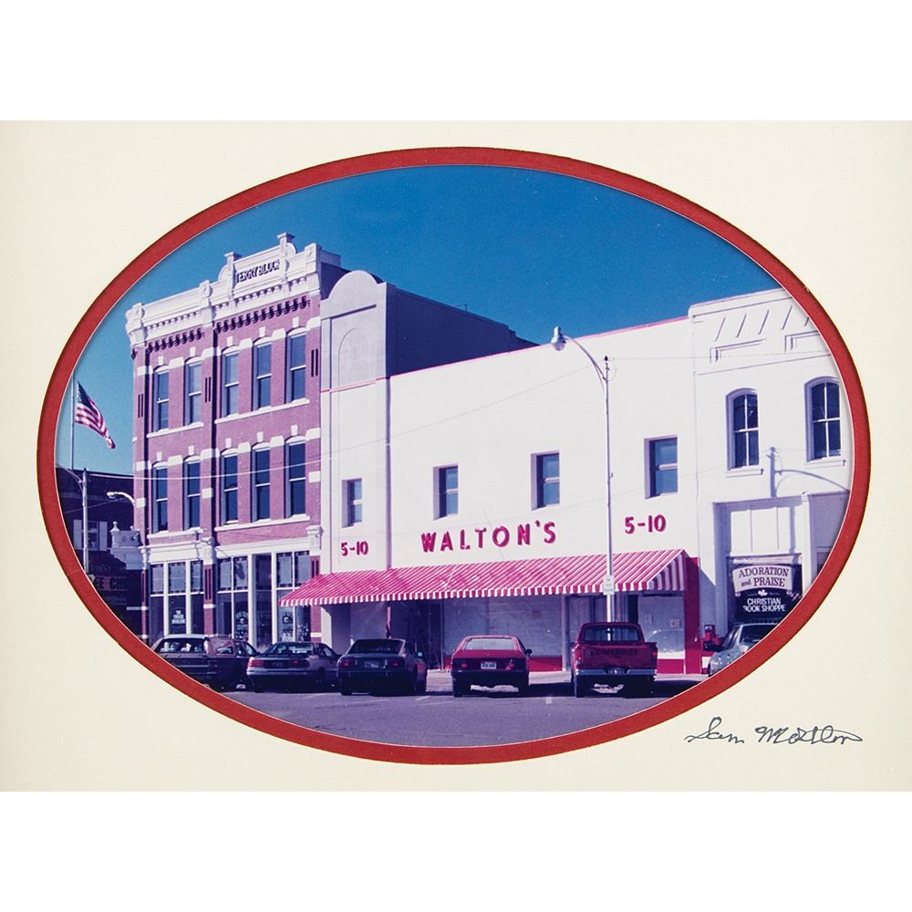 Entrepreneur and the founder of Wal-Mart (1918–1992), the world's largest corporation by revenue, as well as the biggest private employer in the world. Oval color glossy 10.75 x 8 photo of the very first store to bear the Walton name—the Walton's Five and Dime variety store in Bentonville, Arkansas—signed on the original matting in black ink by Sam Walton. Framed to an overall size of 16.75 x 13.75. In fine condition.