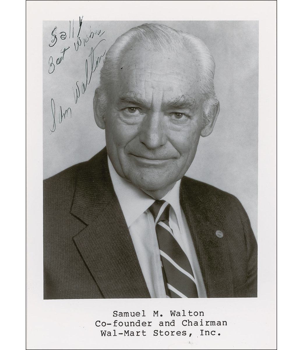 Entrepreneur and the founder of Wal-Mart (1918–1992). Glossy 5 x 7 photo, signed and inscribed in black ink “Sally, Best wishes, Sam Walton.” In fine condition, with some irregular ink adhesion to inscription.