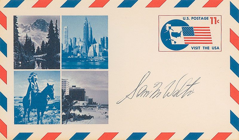 Commemorative postcard, 5.5 x 3.25, with a composite cachet honoring America, signed in black ballpoint, “Sam. M. Walton.” In fine condition.