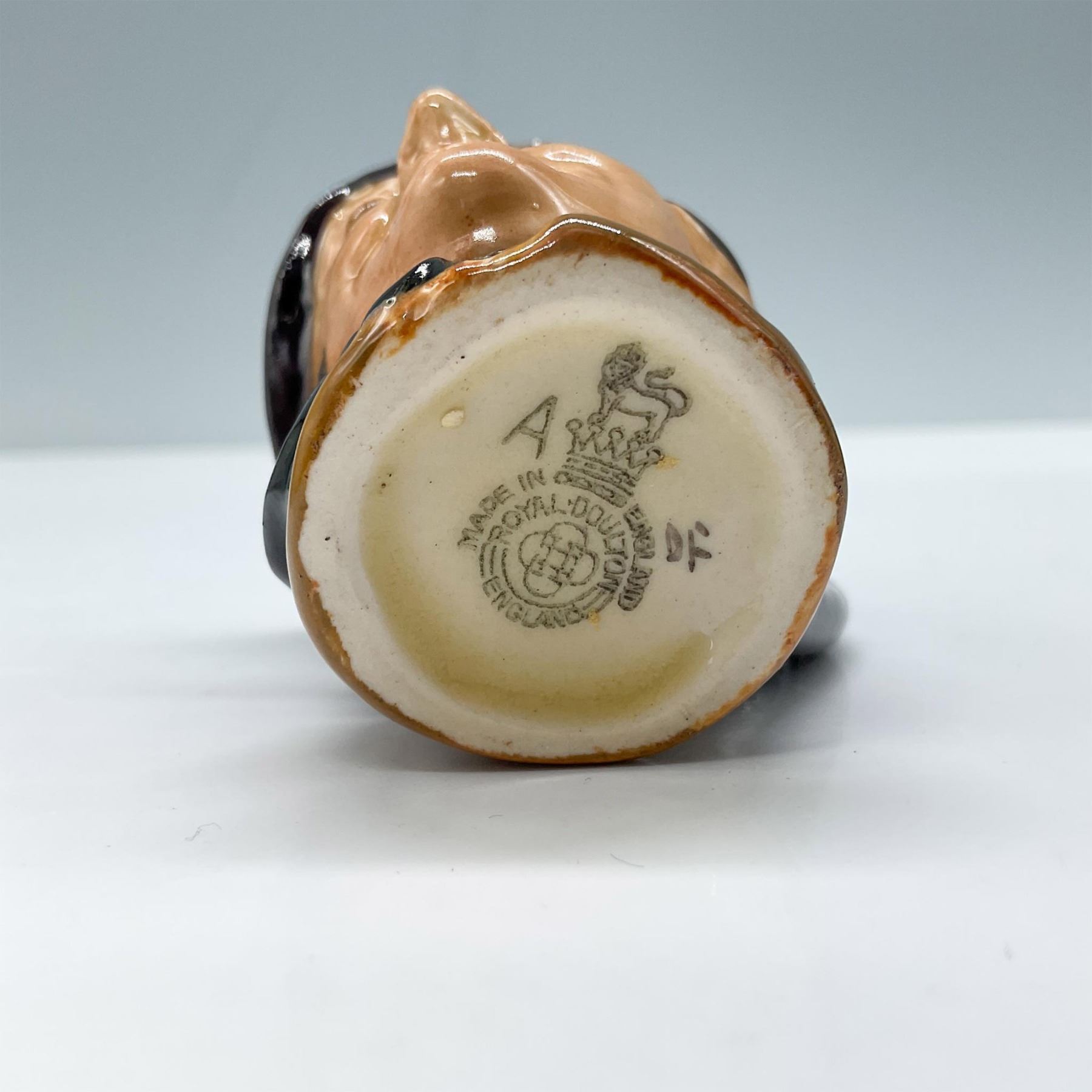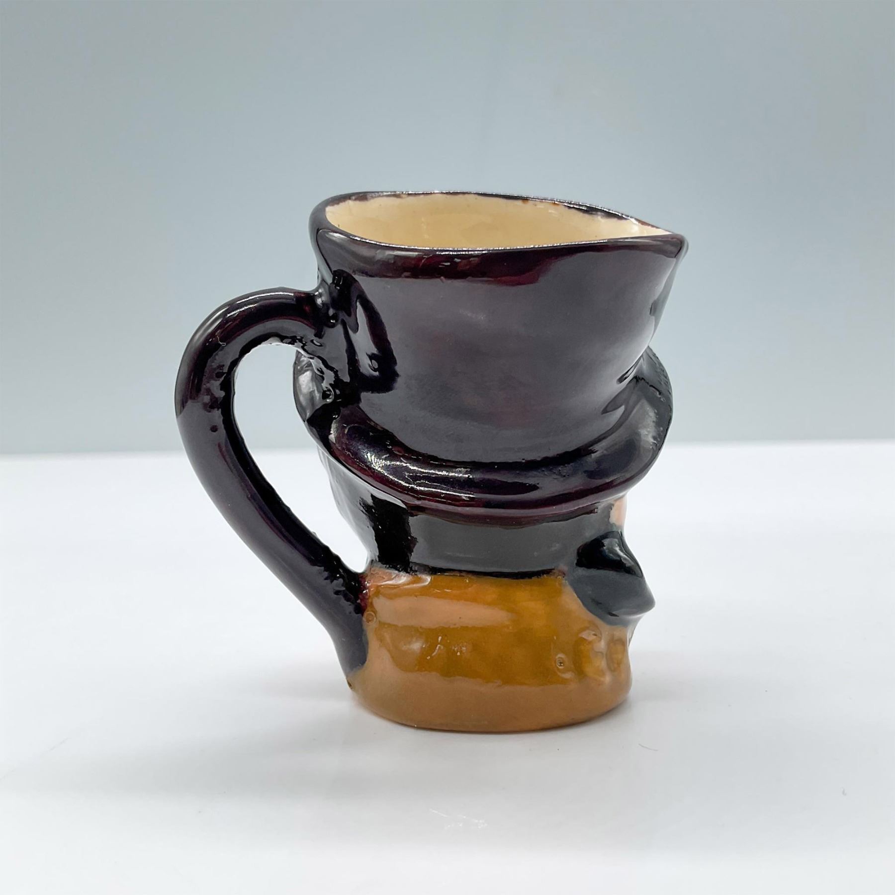 Figural jug of a Charles Dickens character from The Pickwick Papers. Orange coat with a black scarf and hat. A plain black handle. Royal Doulton backstamp.
