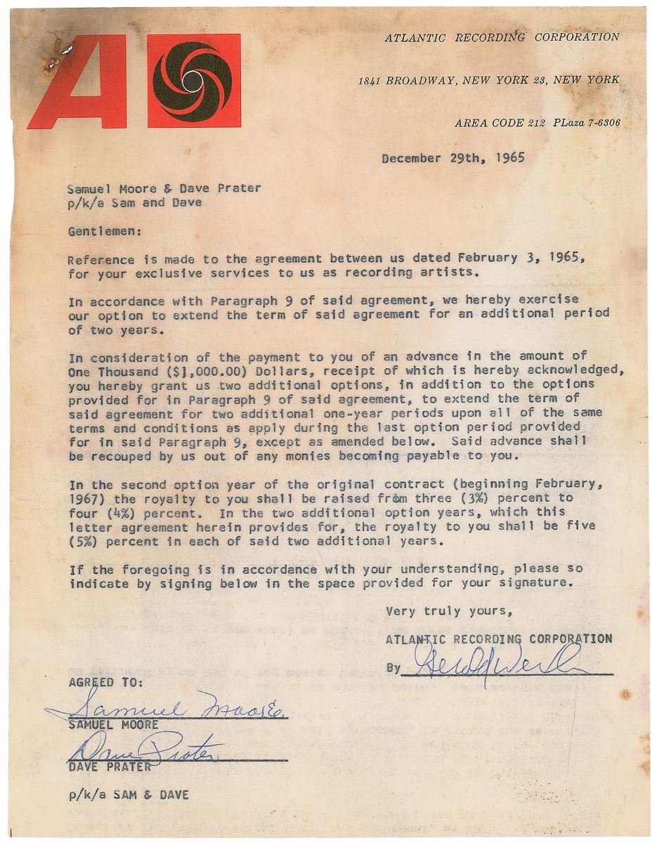 DS, one page, 8.5 x 11, December 29, 1965. Agreement between Moore and Prater with the Atlantic Recording Corporation in which the latter exercises their “option to extend the term of said agreement for an additional period of two years.” Signed at the conclusion in blue ballpoint by both, “Samuel Moore” and “Dave Prater,” and countersigned by an Atlantic Records representative. In very good condition, with staple holes and irregular overall staining.