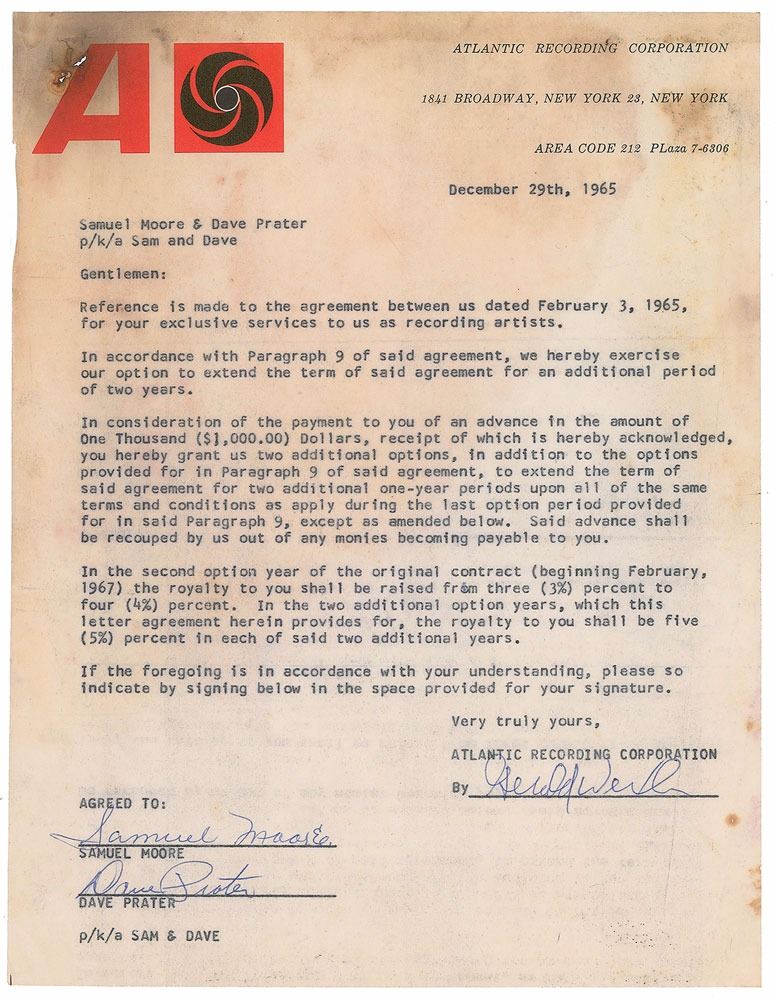DS, signed “Samuel Moore" and "Dave Prater,” one page, 8.5 x 11, December 29, 1965. Agreement between Atlantic Recording Corporation and Sam & Dave, in which the former exercise an option to extend the term of their prior contract for an additional period of two years, with an advance payment in the amount of $1,000. Signed at the conclusion in ballpoint by Moore and Prater. In very good to fine condition, with scattered staining, heaviest to the top.