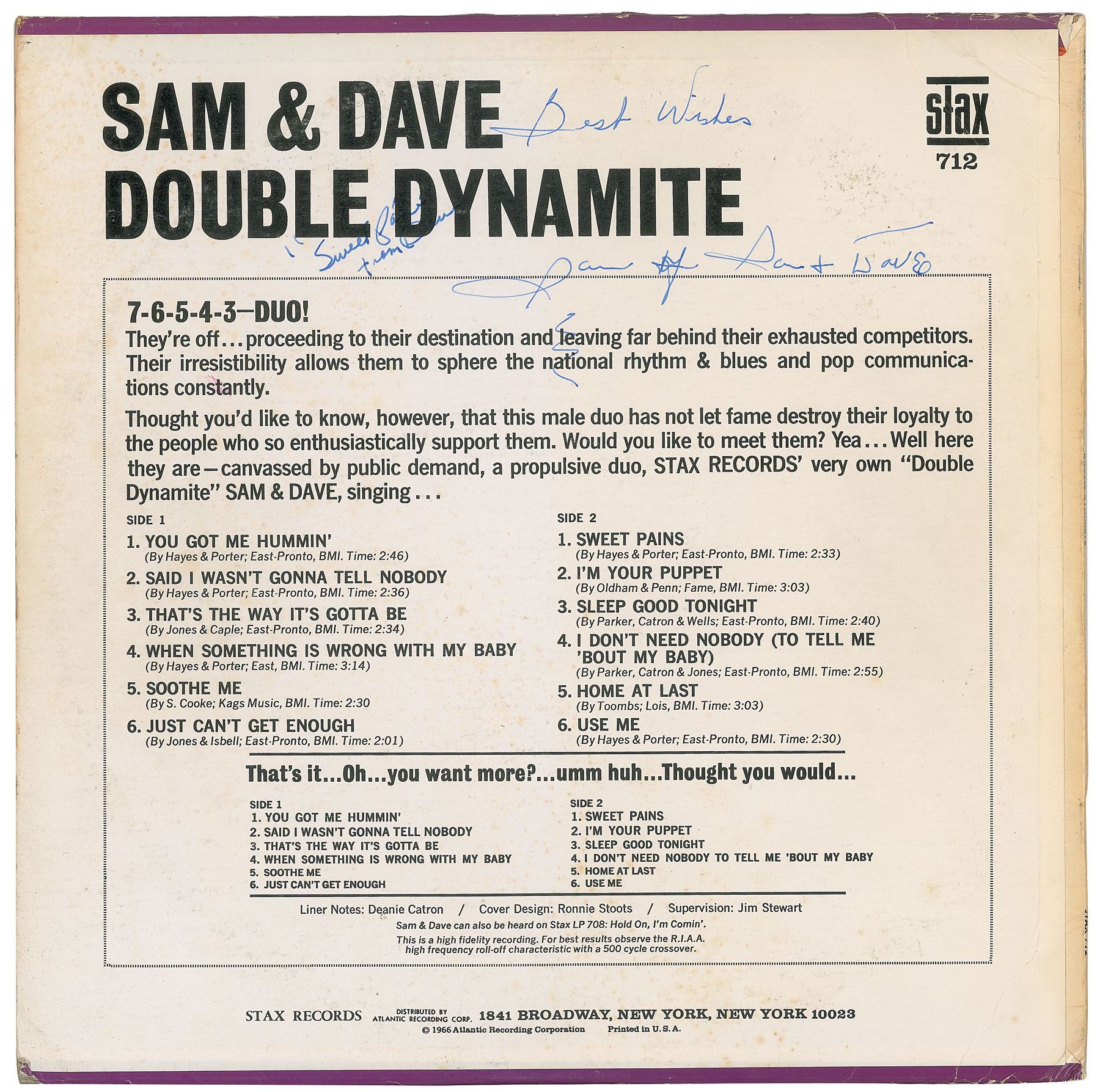 Double Dynamite album signed and inscribed on the front cover in fountain pen by Sam Moore, "Best Wishes, Sam of Sam & Dave," and Dave Prater, "'Sweet Pains,' from Dave." In fine condition, with some corner creasing. The record is included. Accompanied by a full letter of authenticity from REAL.