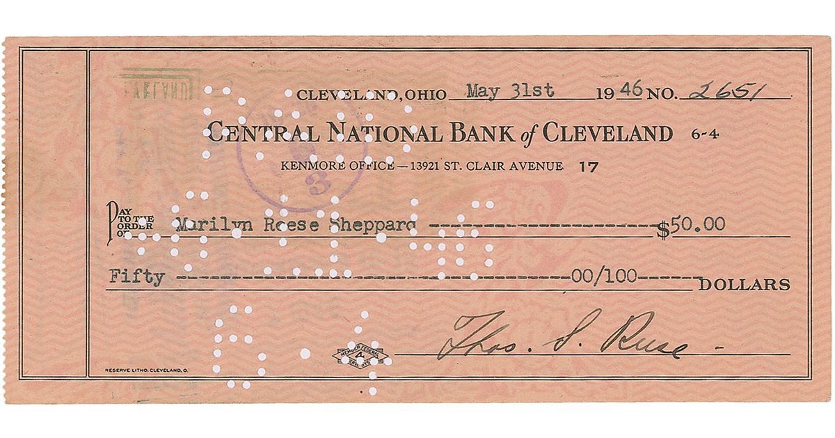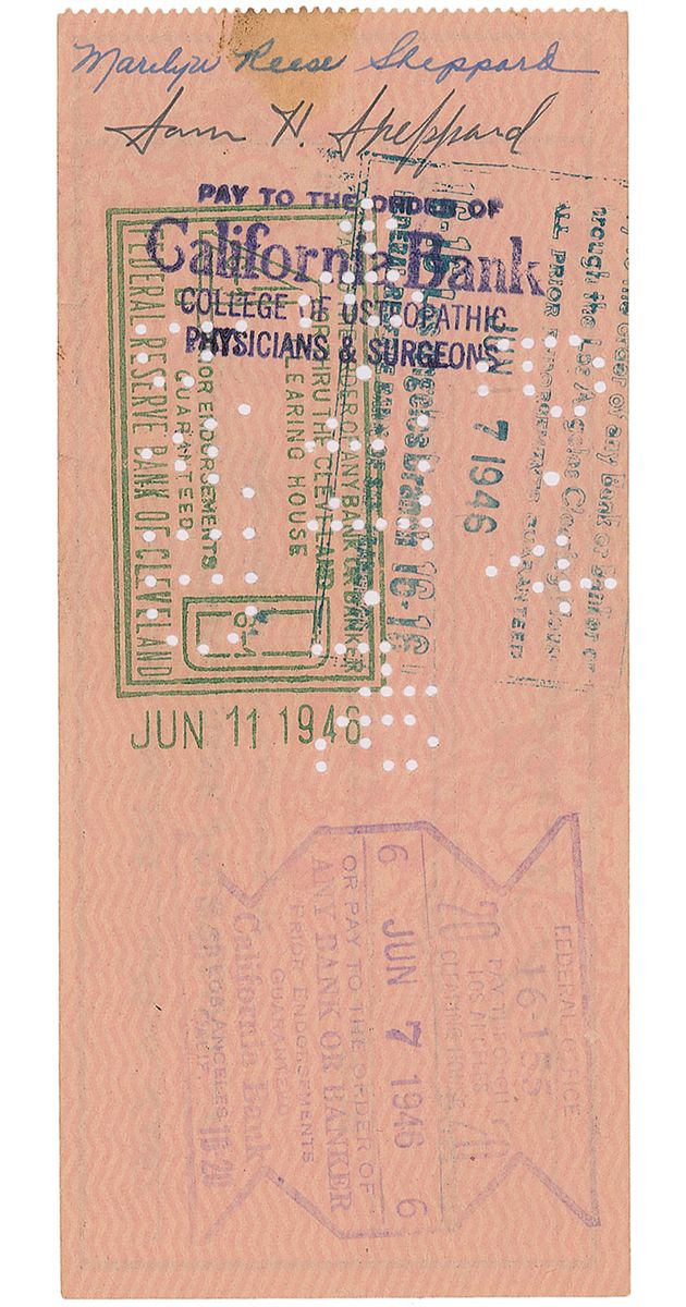 Endorsed bank check, 6.25 x 2.75, filled out in type and signed by Thomas Reese, payable to Marilyn Reese Sheppard for $50.00, May 31, 1946. Endorsed on the reverse, “Marilyn Reese Sheppard,” and “Sam H. Sheppard.” In fine condition, with expected stamps and holes, and a small block of toning to Marilyn’s signature from old tape.