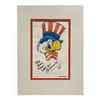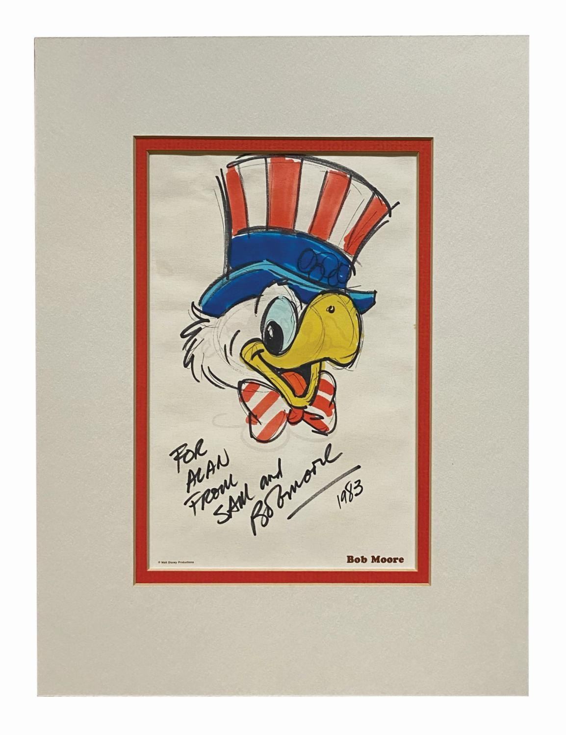 (Disney, 1983) An original sketch of Sam the Olympic Eagle by Disney Legend Bob Moore. When the 1984 Los Angeles Olympics came to California studios for the design of the mascot for the games, it was Moore's Sam the Eagle who won the bid. This fantastic ink and marker drawing is signed "For Alan" on Moore's Walt Disney Productions stationery. Measuring 8.5"x5.5" in its 13"x10" mat, the drawing is in very good condition with minor handling wear.