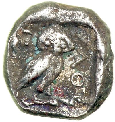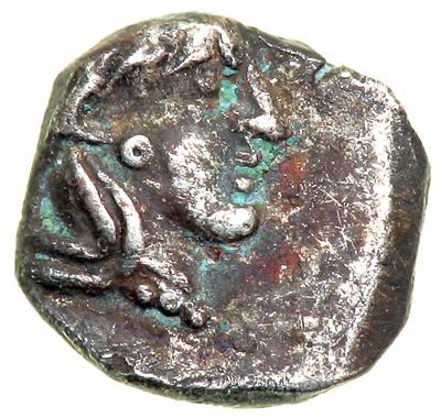 Samarian (Judaean). Athenian Imitative Coinage, c. 400-332 B.C.E., AR Hemi Obol (0.2g). Facing head right (Athena?). Reverse: Owl standing right, lily in left field, AThE on right. Unlisted variety. Back of head off flan; reverse well centered. Very Fine.