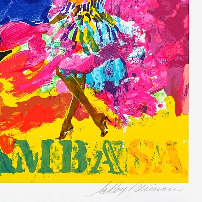 "Samba Samba" is a limited edition serigraph on paper by LeRoy Neiman (1921-2012), numbered 216/500 and hand signed by the artist. Includes Letter of Authenticity. Measures approx. 42.5" x 30" (border), 36" x 24" (image). There is very minor creasing on the bottom-right corner of the white border area that will be concealed when framed.