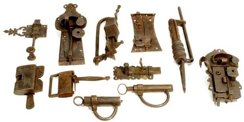 Sammlung "Antike Schlösser", um 1800 11 frühe handgeschmiedete Schlösser und Schließmechanismen in unterschiedlicher Konstruktion und Ausführung. Mit Tür- oder Torschlössern, Vorhängeschlössern und abschließbaren Riegeln, zum Teil aufwendig verziert, bis auf 2 Schlösser komplett mit Schlüssel! – Eine wahre Fundgrube! Great collection of early antique locks 11 hand-forged iron locks in different constructions, partly costly decorated; with door or gate locks, pad locks and closeable latch plates, only 2 keys missing. – A real treasure find! – (3/3) – € 200/300 – (348/4)