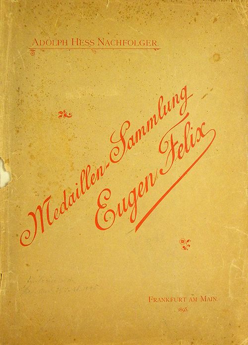 Hess, Adolph. SAMMLUNG EUGEN FELIX. KUNSTMEDAILLEN HAUPTSÄCHLICH AUS DER PERIODE DER DEUTSCHEN RENAISSANCE. Frankfurt a.M., 23.-25. September 1895. Folio, original printed wraps. (4), 47, (1) pages; 301 lots; 6 very fine plates. Hand-priced in red ink. Front wrap reattached with archival tape; very good. Important and rare. Clain-Stefanelli 14358.