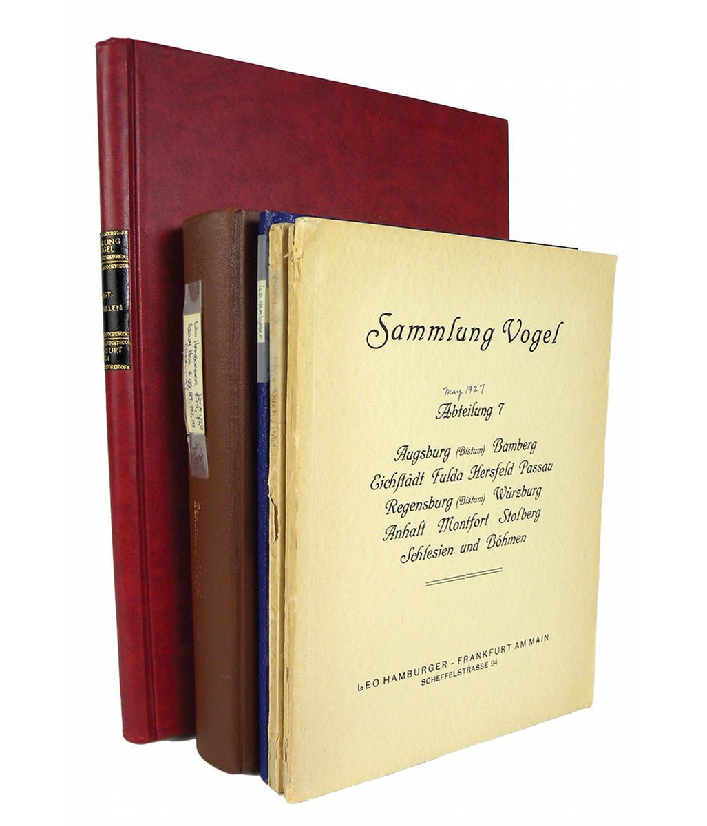 [Vogel Collection]. Various firms. All but the book sale and the rare Sale 6A (the Swedish collection, sold privately to Gunnar Eckström before the scheduled 1926 sale). Includes: SAMMLUNG † GEHEIMRAT HERMANN VOGEL, CHEMNITZ. 1 ABTEILUNG: KUNSTMEDAILLEN. Frankfurt am Main: Leo Hamburger, 4. November 1924. (8), 38, (2) pages; 204 lots; fine frontispiece portrait; 22 very fine plates of medals. Folio format. [with] SAMMLUNG VOGEL. ABTEILUNG 2: PFALZ, WÜRTTEMBURG, ITALIEN. Frankfurt am Main: Leo Hamburger, 10. November 1924 und folgende Tage. (2), 79, (1) pages; 1341 lots; 25 fine plates. [with] SAMMLUNG VOGEL. ABTEILUNG 2: PFALZ, WÜRTTEMBURG, ITALIEN. Frankfurt am Main: Leo Hamburger, 10. November 1924 und folgende Tage. (2), 79, (1) pages; 1341 lots; 25 fine plates. [with] SAMMLUNG VOGEL. ABTEILUNG 3: BRANDENBURG-PREUSSEN, BRAUNSCHWEIG. Frankfurt am Main: Leo Hamburger, 19. Januar 1925 und folgende Tage. (4), 56 pages; 1342-2406 lots; lacking the 23 plates called for. [with] SAMMLUNG VOGEL. ABTEILUNG 4: NIEDERSÄCHSISCHE STÄDTE, WESTFALEN, NACHTRAG ITALIEN UND WÜRTTEMBURG. Frankfurt am Main: Leo Hamburger, 31. August 1925 und folgende Tage. (2), 38, (2) pages; lots 2407-3010; 12 fine plates. [with] SAMMLUNG VOGEL. ABTEILUNG 5: RHEINLAND. Frankfurt am Main: Leo Hamburger, 4.-5. Januar 1926. (2), 45, (1) pages; lots 3011-3666; 15 fine plates. [with] SAMMLUNG VOGEL. ABTEILUNG 6: NASSAU, FRIEDBURG, MECKLENBURG, WALLENSTEIN, POMMERN. Frankfurt am Main: Leo Hamburger, 30.-31. August 1926. (4), 34 pages; lots 3667-4165; 14 fine plates. [with] SAMMLUNG VOGEL. ABTEILUNG 7: AUGSBURG (BISTUM), BAMBURG, EICHSTÄDT, FULDA, HERSFELD, PASSAU, REGENSBURG (BISTUM), WÜRZBURG, ANHALT, MONTFORT, STOLBERG, SCHLESIEN UND BÖHMEN. Frankfurt am Main: Leo Hamburger, 2.-3. Mai 1927. (4), 49, (1) pages; lots 4166-4905; 10 fine plates. [with] SAMMLUNG VOGEL: OESTERREICH-UNGARN, RUSSLAND, POLEN, BALTISCHE PROVINZEN, DÄNEMARK, NORDWESTDEUTSCHLAND. Frankfurt: Adolph Hess, 28. November 1927 und folgende Tage. (8), 135, (1) pages; 2800 lots; 32 fine plates. [with] SAMMLUNG VOGEL: SÜDDEUTSCHLAND, ELSASS, LOTHRINGEN, FRANKREICH, GROSS-BRITANNIEN, NIEDERLANDE, SPANIEN, PORTUGAL. Frankfurt am Main: Adolph Hess, 16. April 1928 und folgende Tage. (6), 117, (3) pages; lots 2801-5378; 24 fine plates. [with] SAMMLUNG VOGEL: SCHWEIS, SACHSEN, ERNESTINISCHE LINIE, ALBERTINISCHE LINIE, HAMBURG, LÜBECK, BREMEN. Frankfurt am Main: Adolph Hess, 8. Oktober 1928 und folgende Tage. (4), 125, (1) pages; lots 5379-7838; 25 fine plates. [with] SAMMLUNG VOGEL. GRIECHEN. RÖMER. BYZANTINER. BRAKTEATEN. MEDAILLEN. Frankfurt am Main: Adolph Hess, 25.-26. März 1929. (4), 73, (1) pages; 1241 lots; 32 fine plates, the first in color; hand-written prices realized list. Eleven catalogues. All 4to except for the first (which is folio). First sale in red leatherette; Hamburger Sales 3 and 6 and all four Hess sales bound in one volume (later brown cloth, gilt); Hamburger Sale 4 in blue cloth; rest in original printed card covers. Generally near fine. Eleven installments of this massive and wide-ranging sale, essentially complete (lacking only the book sale and a very rare segment sold prior to being offered at auction). The first sale is highly important for medals, and features an overview of the collection written by Georg Habich. Clain-Stefanelli 14380. Grierson 274.