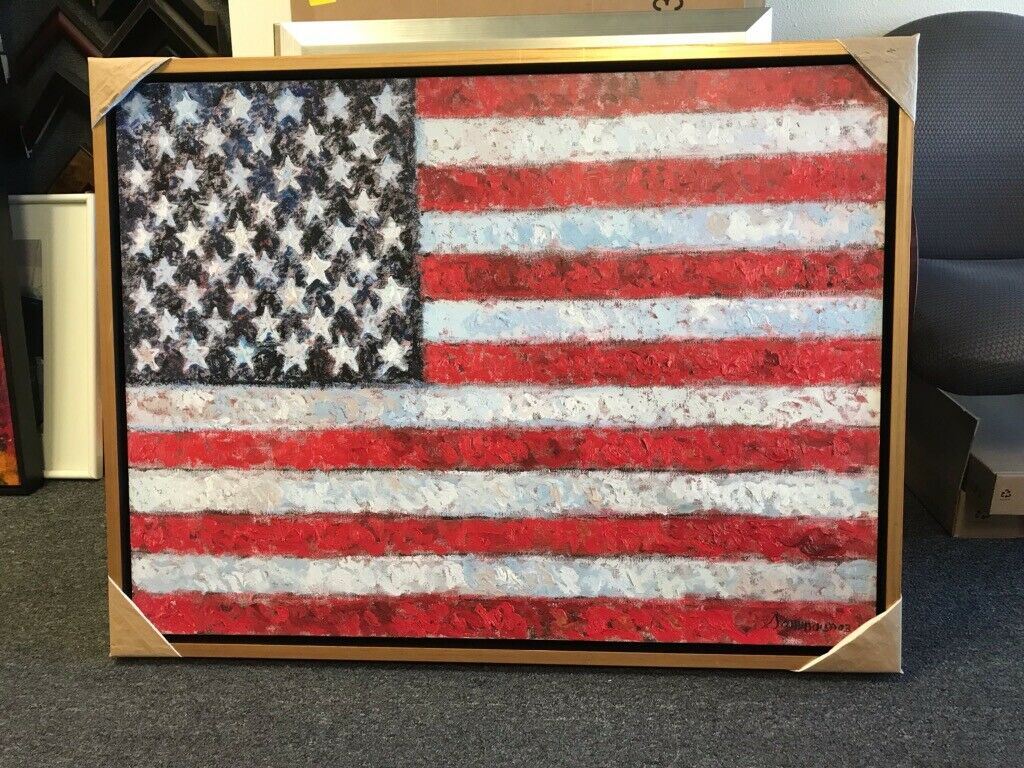 Stretched & framed in a simple modern gold moulding, Samir Sammoun's "FREEDOM" was created after 9/11 to honor the American heroes who lost their lives trying to save others. Sammoun's style and Jasper Johns vision merge in the 30x40" giclee on canvas.