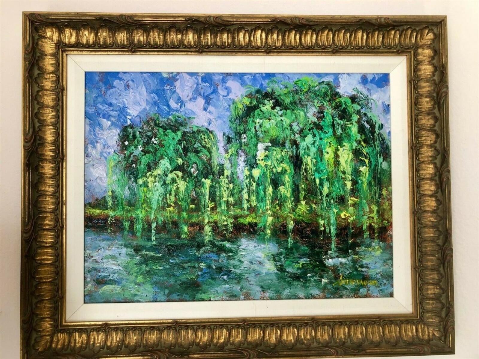 Museum artist Samir Sammoun created this wonderfully textured Original oil of two Willows at the riverbank. It is 12x16,unframed but comes perfectly framed 17x21"in gold moulding and linen liner.