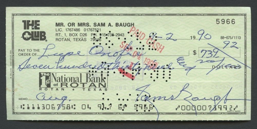Personal check from 1990 hand-signed in blue ink by Sammy Baugh (Redskins HOF D 2008). Autograph includes a Pristine Auction LOA and lifetime guarantee for authenticity purposes.
