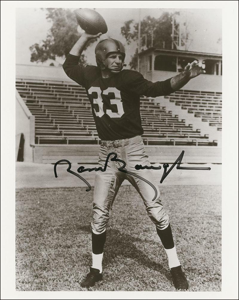 Glossy 8 x 10 photo of Baugh with his arm raised to throw a pass, signed in black felt tip. In fine condition, with a few scattered light creases and surface dings.