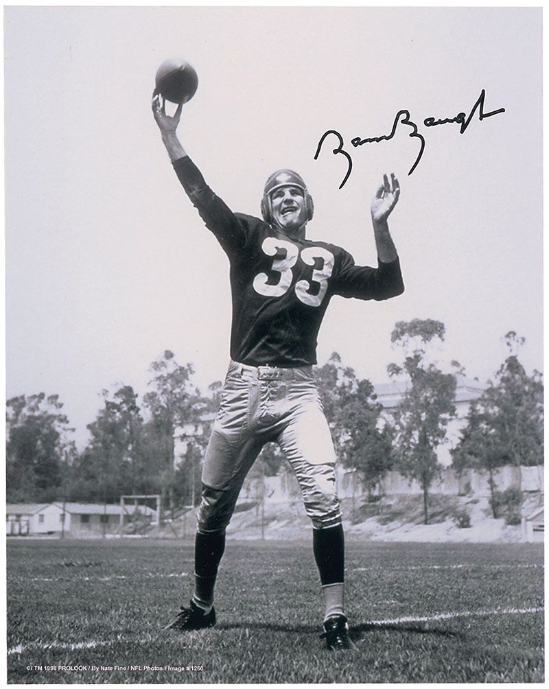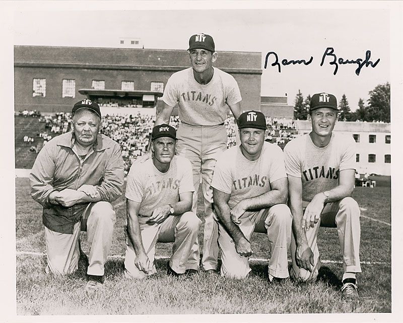 Two glossy photos: an 8 x 10 of Baugh throwing a football signed in black felt tip; and a 10 x 8 of Baugh posing with his Titan coaches, both signed in black felt tip. In very fine condition.